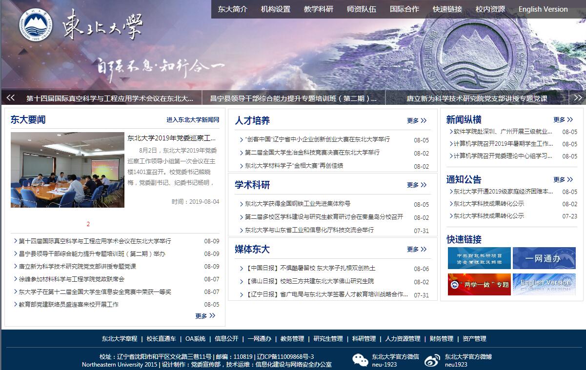 东北大学始建于1923年4月26日,是一所具有爱国主义光荣传统的大学。1928年8月至1937年1月,著名爱国将领张学良将军兼任校长。1949年3月,在东北大学工学院和理学院(部分)的基础上成立沈阳工学院。1950年8月,定名为东北工学院,1993年3月,复名为东北大学,1997年1月原沈阳黄金学院并入东北大学,1998年9月划转为教育部直属高校。学校是国家首“211工程”和“985工程”重点建设的高校,2017年9月,经国务院批准,进入一流大学建设行列。在90余年的办学历程中,东北大学始终坚持与国家发展和民族复兴同向同行,形成了“自强不息、知行合一”校训精神。历史上,东北大学师生曾是“一二·九”运动的主力和先锋,在建设时期,学校先后研发出国内第一台模拟电子计算机、第一台国产CT、第一块超级钢以及钒钛磁铁矿冶炼新技术、钢铁工业节能理论和技术、控轧控冷技术、混合智能优化控制技术等一大批高水平科研成果,兴办了第一个大学科学园,培育了东软、东网等高新技术企业,在技术创新、转移和产学研合作方面形成了自己的办学特色。东北大学坐落在东北中心城市辽宁省沈阳市,在河北省秦皇岛市设有东北大学秦皇岛分校。学校占地总面积255万平方米,建筑面积168万平方米。学校现有教职工4538人,其中专任教师2711人。有中国科学院和中国工程院院士4人,海外院士4人,国家“千人计划”入选者22人,青年千人计划10人。国家“高层次人才特殊支持计划”入选者8人,教育部“长江学者奖励计划”特聘教授、讲座教授27人,国家杰出青年基金获得者23人,海外及港澳学者合作研究基金获得者16人,教育部新世纪优秀人才102人,国家“百千万人才工程”入选者14人。国家自然科学基金创新群体4个,教育部创新团队3个。学校设有100多个研究机构,其中国家重点实验室3个,国家工程(技术)研究中心4个,国家工程实验室3个。设有国家级协同创新中心2个,辽宁省协同创新中心3个。学校学科涵盖哲学、经济学、法学、教育学、文学、理学、工学、管理学、艺术学等门类。设有68个本科专业,其中国家级特色专业15个;有179个学科有权招收和培养硕士研究生(另设10个专业学位授权点),109个学科有权招收和培养博士研究生;有17个博士后流动站;3个一级学科国家重点学科,4个二级学科国家重点学科,1个国家重点(培育)学科,共涵盖16个二级学科。学校以一流为目标、以改革为动力推进学科布局优化和调整,高峰引领、高原支撑、卓越促进、特色牵动,可持续发展的学科建设格局正在形成。东北大学具备培养学士、硕士、博士和博士后的完整教育体系。学校全日制在校生45000余人,其中本科生29872人,硕士研究生11364人,博士研究生3850人。学校围绕立德树人的根本任务,在拔尖创新型人才培养、教学理念更新、教学方法研究、培养模式探索等方面取得了丰硕成果。“十二五”以来,东北大学共获得国家级教学成果奖3项,国家级精品视频公开课11门,国家级精品资源共享课课程15门,国家级精品在线开放课程(慕课)6门,国家级“十二五”规划教材18种。获得全国优秀博士学位论文提名5篇。学生获得创新创业竞赛国际大奖497项、国家级奖励1967项、优秀创新创业项目1580项,专利384项,共有56家学生创业企业落地。学生生源质量、毕业生就业率及就业质量保持较高水平。学校坚持服务国家战略和区域发展的科研方向,鼓励自由探索,推动协同创新,基础研究水平稳步提高,技术创新的竞争力不断增强。“十二五”以来,学校承担各类科技项目6387项,获各类科技奖励279项,其中国家级奖励14项,省部级一等奖58项;获得国家专利1499项,其中发明专利1127项;被三大检索收录的论文共14644篇。主(承)办国际、国内学术会议161次,其中国际会议65次。学校在技术创新和成果转化方面形成了独特的比较优势,探索出了一条政产学研用相结合的有效途径,实现了学科、人才、科研、产业良性互动发展。2016年,学校高新技术产业销售收入110亿元,科技产业综合指标名列全国高校第三位。学校坚持面向新一代信息技术、新材料、生命健康等领域,新建云计算科技园、新材料产业园、健康产业园,推进云计算和大数据产业快速发展,推动辽沈地区装备制造业创新升级,为东北大学服务国民经济建设和东北老工业基地全面振兴奠定了新的重要基础。学校面向世界,开放办学,先后与36个国家和地区的219所大学、研究机构建立了长期稳定的合作关系;加大引进海外人才的力度,进一步提升引进国外智力的层次,建立了4个国家学科创新引智基地,每年聘请300多位海外知名专家来校讲学或合作科研;提高学生的国际化视野与专业水平,学校积极拓展包括国家公派、联合培养、交换学习、短期交流、海外实习等海外交流项目,每年派出600多名各层次学生赴海外高校交流学习;不断扩大留学生规模,提高培养质量,2017年有来自97个国家和地区的各类留学生1500多名在校学习。面向未来,东北大学将继续遵循“教育英才”的办学宗旨,坚定地走“创新型、特色化、开放式”发展道路,为建成“在中国新型工业化进程中起引领作用的‘中国特色、世界一流’大学”而奋斗。