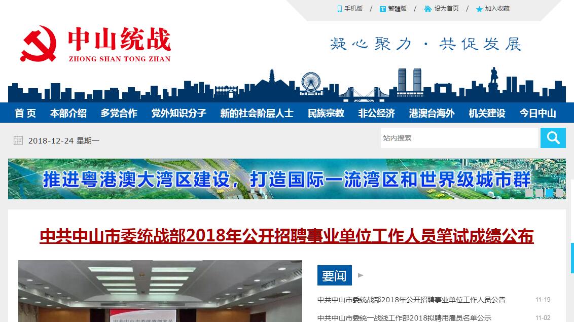中山市委统战部主要职责:一、贯彻执行中央和省委有关方针、政策;调查研究统一战线的理论和方针、政策,向市委反映统一战线情况,提出统战工作的意见和建议;检查统战政策执行情况,协调统一战线各方面的关系。二、负责联系市各民主党派和无党派代表人士,通报情况,反映意见和建议;研究、贯彻落实与完善多党合作和政治协商制度以及对民主党派工作的有关方针、政策;落实中央和省委关于发挥民主党派和无党派代表人士参政议政和民主监督作用的工作;为市委与各民主党派进行政治协商做好组织联络工作;受市委委托,向民主党派、无党派人士通报市委有关会议精神;支持、帮助市各民主党派加强自身建设,选拔培养新一代代表人物,协调有关部门帮助市各民主党派改善工作条件。三、负责党外人士政治安排;会同有关部门做好培养、考察、选拔、推荐、安排党外人士担任政府和司法机关领导职务的工作;协同做好党外后备干部和新的代表人物队伍的建设工作,协同做好民主党派、无党派人士代表人士、党外干部的培训工作。四、负责开展以祖国统一为重点的海外统战工作;联系香港、澳门和海外有关社团及代表人士;协调港澳统战工作。五、调查研究并反映非公有制经济代表人士的情况,协调关系,提出政策建议,团结、帮助、引导、教育非公有制经济代表人士,开展思想政治工作。组织非公有制经济人士学习培训。做好非公有制经济代表人士的政治安排。履行全市行业协会商会工作协调小组办公室职责,做好促进全市行业协会、商会发展的协调指导工作。指导工商联开展工作。六、调查研究党外知识分子的情况,反映意见,协调关系,提出政策建议,联系并培养党外知识分子的代表人物。七、贯彻执行党的民族、宗教工作的方针、政策;联系少数民族、宗教界代表人士;协助有关部门做好少数民族干部、宗教界代表人士的培养和推荐工作。八、负责全市分管统战工作的党政领导干部、党外人士和统战干部的培训工作。九、指导镇、区党委统战工作,协调政府有关部门的统战工作。十、负责开展海内外统一战线的宣传工作。十一、承办市委和上级统战部门交办的其他任务。