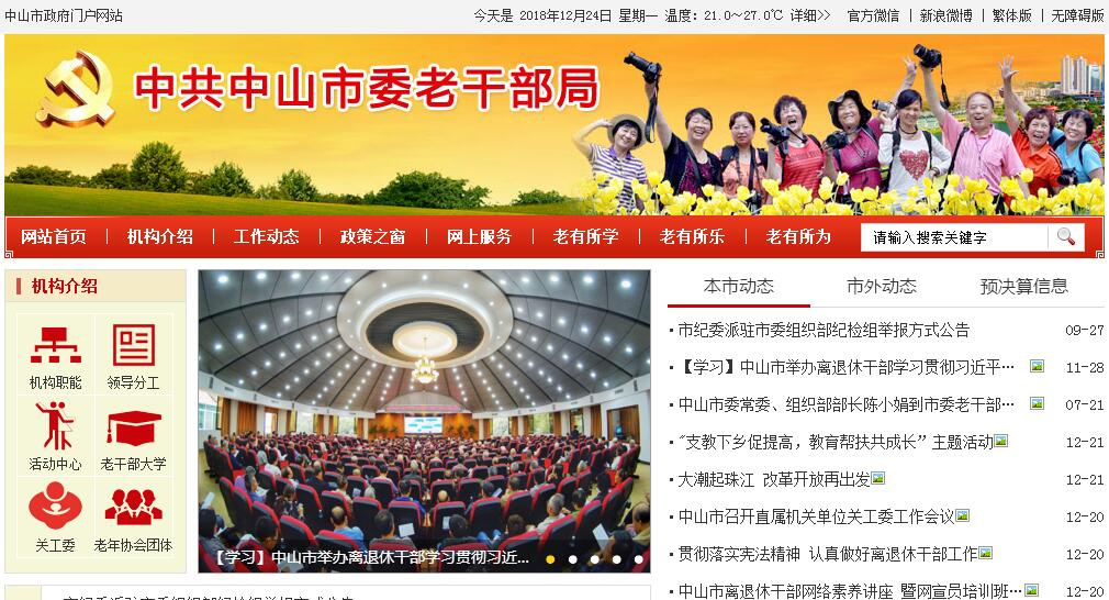 | 网站简介: 中共中山市委老干部局是市委主管全市离退休干部管理工作的行政机构。其主要职责:(一)贯彻执行党中央、国务院、省委、省政府和市委、市政府有关老干部工作的方针、政策;制定或参与制定我市老干部工作的政策、规定。(二)负责管理老干部工作,提出改进工作的意见和建议。(三)督促老干部的政治待遇、生活待遇的落实和保障机制的建立健全。(四)组织协调老干部参加的重大活动,指导老干部活动场所、老干部学校及协会的建设、管理和服务工作。(五)负责市外老干部及老干部工作人员来中山的接待工作,协调有关部门做好老干部的医疗保健工作;指导和协助有关单位做好老干部丧事办理工作。(六)负责市属公有企业离休干部和转制企业副处级以上退休干部的服务管理工作。(七)指导老干部工作机构的自身建设,组织培训;负责老干部的信息、统计、信访工作。(八)承担市关心下一代工作委员会的日常工作。(九)承办上级交办的其他事项。 |