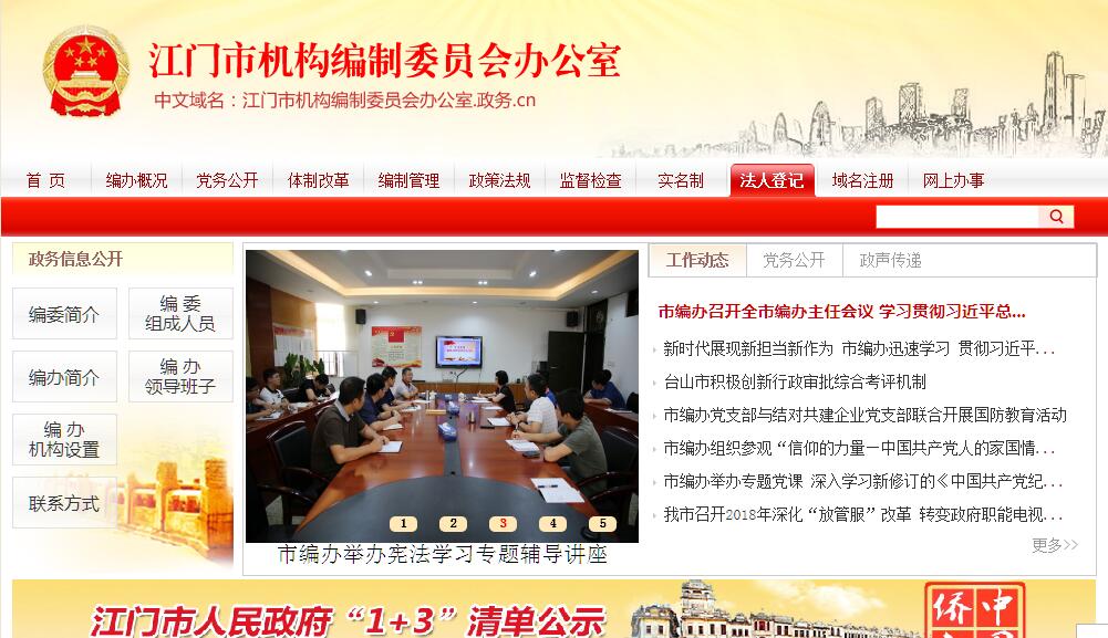 江门市机构编制委员会办公室是市机构编制委员会的常设正处级办事机构,在市编委的领导下具体负责全市行政管理体制和机构改革以及机构编制的日常管理工作。其主要职责:(一)贯彻执行中央、省关于行政管理体制和机构改革、机构编制管理的方针政策、法律法规以及市委、市政府的有关工作部署和要求,统一管理全市党政群机关(含党委、政府各部门,人大、政协、法院、检察院机关,民主党派和人民团体机关,以及其他行政机构,下同)和事业单位的机构编制。(二)负责拟订本市行政管理体制和机构改革总体方案并组织实施,审核市直机关和各市、区机构改革方案,指导各市、区、乡镇(街道)、各类开发区的行政管理体制、机构改革和机构编制管理工作。(三)管理市直机关的职责配置、人员编制和领导职数,审核各市、区机关的机构设置与调整,审核各市、区、乡镇(街道)行政编制总额的分配和调整。(四)协调市直机关之间、市直机关与各市、区之间的职责分工。(五)负责审核市级议事协调机构、由市领导同志担任召集人(主持人)的联席会议的设立和调整工作。(六)负责拟订本市事业单位管理体制和机构改革总体方案并组织实施,管理市属事业单位的机构编制,指导各市、区、乡镇(街道)事业单位管理体制和机构改革以及机构编制管理工作。(七)监督检查全市各级行政管理体制和机构改革方案、事业单位管理体制和机构改革方案、市直机关“三定”规定和事业单位机构编制方案以及机构编制政策法规的执行情况。(八)负责市属事业单位登记管理工作,指导、监督各市、区事业单位登记管理工作。(九)承办市委、市政府、市机构编制委员会和省机构编制管理机关交办的其他事项。