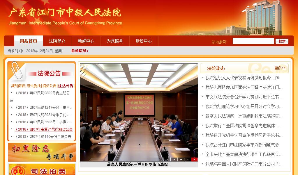 江门市中级人民法院建院于1983年6月1日,内设立案庭、刑一庭、刑二庭、民一庭、民二庭、民三庭、民四庭、行政庭(与赔偿委员会办公室合署)、审监庭、法警支队等审判业务机构,下辖蓬江区、江海区、新会区、台山市、开平市、恩平市、鹤山市7个基层人民法院,基层人民法院共派出中心法庭35个。江门市中级人民法院是国家审判机关,依法独立行使审判权,接受广东省高级人民法院的监督和指导,监督和指导下级法院的审判工作,对江门市人民代表大会及其常务委员会负责并报告工作。其要工作职责是:(一)审判法律规定和上级法院指定由本院管辖的以及本院认为依法应当由自己审判的刑事、民事、行政等第一审案件。(二)审判基层人民法院依照法律规定移送审判的刑事、民事、行政等第一审案件。(三)审判不服基层人民法院判决或裁定的上诉案件及检察院抗诉第二审刑事、民事、行政等案件。(四)审判由市人民检察院按照审判监督程序提出抗诉的案件。(五)审查处理不服本院已发生法律效力的判决或裁定的各类申请再审和申诉案件,对其中确有错误的依照审判监督程序进行再审。(六)审查处理不服基层人民法院已发生法律效力的判决或裁定提出申诉、申请再审而被驳回的案件,对其中确有错误的,依照审判监督程序提审或指令下级人民法院再审。(七)审理减刑、假释案件。(八)对基层人民法院管辖不明或者有争议的案件指定管辖。(九)监督和指导基层人民法院的审判工作和其他工作。(十)依法行使司法执行权和司法决定权。(十一)依法决定国家赔偿。(十二)管理、协调全市法院执行工作。(十三)负责司法鉴定工作。(十四)管理、协调全市法院司法警察工作。(十五)针对案件审理中发现的问题,向有关单位和部门提出司法建议。(十六)指导全市法院系统思想政治、教育培训工作;按照权限管理法官和其他人员;协助管理全市法院系统的机构编制;指导全市法院系统的监察工作。(十七)结合审判工作宣传法制,教育公民自觉遵守宪法、法律和社会公德。(十八)承办其他应由市中级法院负责的工作。