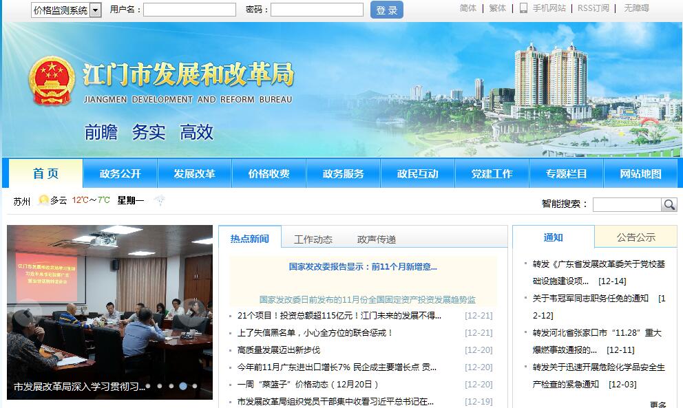 江门市发展和改革局主要职责:(一)贯彻执行国家和省有关国民经济和社会发展的方针政策和法律法规,拟订并组织实施全市国民经济和社会发展战略、中长期发展规划、年度发展计划及国民经济和社会发展计划主要指标,研究提出总量平衡、发展速度和结构调整的调控目标及措施;提出综合运用各种经济手段和政策建议;受市人民政府委托向市人大提交国民经济和社会发展计划的报告。(二)研究分析全市经济形势及发展情况,进行宏观经济的预测、预警,研究宏观经济运行中的重大问题,提出宏观调控的对策和建议,统筹协调经济社会发展。(三)承担指导推进和综合协调经济体制改革的责任,研究经济体制改革的重大问题,提出经济体制改革意见和建议,组织拟订综合性经济体制改革方案,协调有关专项经济体制改革方案;协调商品生产要素市场体系改革和农村经济体制配套改革;监督检查经济体制改革规划、方案的执行情况。(四)贯彻实施国家、省投资主管部门颁布的固定资产投资政策;监测分析固定资产投资状况,研究提出固定资产投资总规模,规划重大项目布局,参与筹措重点项目建设资金;审核上报国家、省审批权限的建设项目,审核或审批限额内的建设项目;编制和下达重点建设项目计划;按规定权限审批、核准重大建设项目、重大外资项目、重大境外投资项目;发布投资信息,引导民间投资方向;拟订政府投资规划、计划,编制下达市级财政性投资计划;参与研究制定城市基础设施、公共配套服务设施规划和建设计划;指导和监督国外贷款建设资金的使用,研究提出利用外资和境外投资的战略、规划。(五)推进经济结构战略性调整和升级,提出重要产业的发展战略和规划。组织拟订综合性产业政策,负责协调第一、二、三产业发展的重大问题并衔接平衡相关发展规划和重大政策,做好与国民经济和社会发展规划、计划的衔接平衡;负责综合交通运输发展规划与国民经济和社会发展规划的衔接平衡;承担干线铁路项目和城际轨道交通网络规划与建设协调职能;协调解决重大技术装备推广应用等方面的重大问题。组织拟订和实施服务业发展战略规划,会同有关部门提出现代物流业发展战略和规划;承担重要商品总量平衡和宏观调控的责任,会同有关部门管理市级粮食等重要物资的储备;研究农村经济发展重大布局,协调农业和农村经济社会发展的有关问题。(六)研究能源开发利用,提出综合能源发展战略并组织实施,完善对能源产业的管理,推进能源结构战略性调整,拟订能源行业发展规划和年度计划,研究提出相关体制改革建议,监测和分析能源产业、能源安全的发展状况,规划重大能源项目布局。(七)组织拟订区域协调发展战略、规划;组织实施主体功能区规划并进行监测评估。 (八)负责社会发展与国民经济发展的政策衔接,参与拟订人口和计划生育、科学技术、教育、文化、卫生、民政等发展政策,研究提出促进就业、调整收入分配、完善社会保障与经济协调发展的政策建议,协调社会事业发展和改革中的重大问题及政策。(九)推进可持续发展战略,研究经济社会与资源、环境协调发展的重大问题,综合协调环保产业有关工作。(十)制定市重点项目储备计划,对列入计划的省、市重点建设项目,进行跟踪、指导、督办、协调,按时编报重点建设项目完成进度情况;组织重大建设项目的稽察工作;依法指导和协调招标投标工作,对重大建设项目招标投标进行监督检查。(十一)组织编制国民经济动员规划、计划,研究国民经济动员与国民经济、国防建设的关系,协调相关重大问题,组织实施国民经济动员有关工作。(十二)贯彻执行国家和省有关价格工作的方针政策和法律法规;制定并组织实施价格管理办法、规定;会同有关部门编制和执行价格改革中长期规划、年度计划。(十三)负责价格分析、预测、预警和监控;提出年度价格总水平控制目标及价格调控措施并组织实施;负责价格调节基金的设立、运作和管理;参与粮食风险基金、储备制度的运作和监督;运用价格杠杆促进经济发展。(十四)拟订价格管理目录,管理国家、省、市列名管理的商品、服务价格及中介服务收费;组织和协调行政事业性收费工作;管理在政府指导价和政府定价外收取保证金、抵押金、风险金费用。(十五)规范经营者价格行为,制止低价倾销、牟取暴利、价格欺诈等不正当价格行为;组织实施商品和收费的明码标价;指导行业价格自律,维护公平竞争的价格秩序。(十六)依法对商品和服务价格、行政事业性收费、经营者和中介组织价格行为进行监督检查,对价格、收费违法违规行为实施行政处罚和行政强制措施。(十七)组织指导群众性的物价监督活动;受理价格、收费投诉举报;指导、监督市直有关部门及各市、区价格、收费管理工作;协调、处理部门之间、行业之间的价格、收费争议。(十八)承办市人民政府和省发展和改革委员会、省物价局交办的其他事项。