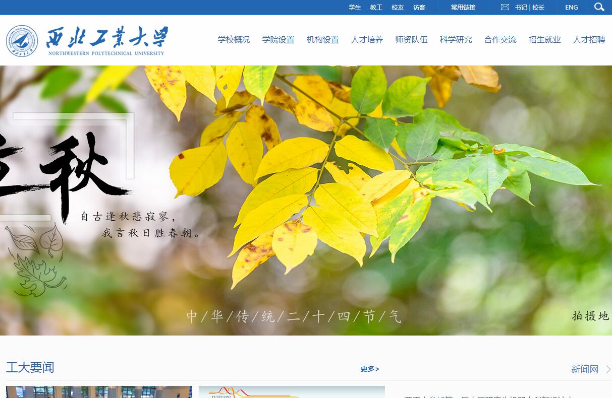 | 网站简介: 西北工业大学(以下简称西工大)坐落于陕西西安,是我国唯一一所以同时发展航空、航天、航海(三航)人才培养和科学研究为特色的多科性、研究型、开放式大学,现隶属于工业和信息化部。新中国成立以来,西工大一直是国家重点建设的高校,1960年被国务院确定为全国重点大学,“七五”、“八五”均被国务院列为重点建设的全国15所大学之一,是全国首批设立研究生院的22所高校之一,1995年首批进入“211工程”,2001年进入“985工程”,2017年进入国家“一流大学”建设高校(A类),是“卓越大学联盟”成员高校,先后获得“全国文明单位”、“全国创先争优先进基层党组织”、“全国毕业生就业典型高校”、“全国文明校园”等荣誉称号和表彰奖励。学校秉承“公诚勇毅”校训,弘扬“三实一新”(基础扎实、工作踏实、作风朴实、开拓创新)校风,扎根西部、献身国防,历史上书写了新中国多个“第一”,今天在创建一流大学和一流学科上续写新的辉煌。 |