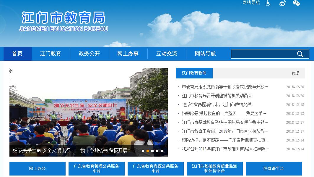 | 网站简介: 江门市教育局是市政府主管市直及兼带市属“四市三区”教育工作的行政职能部门。负责教育行政管理工作,特别是侧重于基础教育、职业教育和成人教育。其主要职责:1、贯彻执行国家教育方针、政策和法规,加强对学校的指导和检查监督;起草地方性的教育规章制度,并组织实施。2、编制全市基础教育事业发展规划,具体制定市直教育事业发展规划,并组织实施。3、指导、协调各市(区)、各部门的有关教育工作。负责教育督导与评估,检查学校执行国家规定和教学大纲计划完成情况。指导办学体制和学校内部管理体制的改革。4、指导分管范围的各级各类学校的德育、智育、体育、卫生、美育、国防教育、教学仪器设备和信息教育。5、组织和指导对分管范围的各级各类学校开展教育科研、教学研究和教学改革等工作。6、规划和管理教育行政干部队伍和教师队伍,加强校长和教师队伍建设。7、负责市直中小学的基建投资、事业费预算分配和决策的审核。8、协调有关部门搞好全市的成人教育、社会力量办学和民办学校的审批管理。9、完成市委、市人民政府和省教育厅交办的其它事项。 |