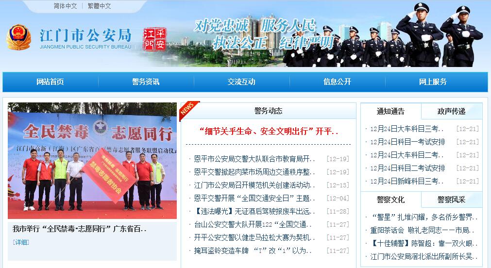 江门市公安局主要职责:(一)贯彻执行中央和省、市有关公安工作的方针政策和法律法规,拟订地方性公安规章,部署、指导、监督全市公安工作。(二)依法预防、制止和惩治违法犯罪活动,维护国家安全,维护社会治安秩序,掌握影响社会稳定、危害国家安全和社会治安的情况并提出对策。(三)组织、指导全市公安机关侦查工作,协调处理或直接侦办重大刑事犯罪案件、国内危害国家安全的犯罪案件以及涉及全市的重大经济犯罪案件。(四)协调处置重大治安事件和群体性事件,指导、监督全市公安机关依法查处危害社会治安秩序的行为,依法管理户口、居民身份证、门(楼)牌、枪支弹药、危险物品和特种行业,指导、监督机关、团体、企事业单位的安全保卫工作及其组织建设,负责对保安服务组织实施监督管理和业务指导。(五)负责维护全市道路交通安全和道路交通秩序、处理交通事故以及对机动车辆(不含拖拉机)、驾驶人员的管理工作。(六)负责管理出入境事务以及外国人、港澳台人员在江门境内居留、旅行的有关工作。(七)负责全市公共信息网络安全监察工作。(八)组织、指导、协调对恐怖活动的防范、侦查工作,防范、处理邪教组织的违法犯罪活动。(九)指导、监督全市公安机关依法承担的执行刑罚工作,指导、监督全市公安监所管理工作,负责本级看守所、强制隔离戒毒所、拘留所、收容教育所的管理工作,负责收容教养和劳动教养审批工作。(十)负责国家规定的特定人员的警卫工作。(十一)指导消防工作,依法进行消防监督。(十二)指导林业部门的公安业务工作。(十三)负责全市公安队伍建设,组织实施公安机关督察工作,查处或督办公安队伍违法违纪案件,指导、监督全市公安机关的执法活动。(十四)负责公安科研工作,规划公安机关指挥系统、通信、信息技术、刑事技术和技术侦察建设。(十五)承办市委、市政府和上级公安机关交办的其他事项。