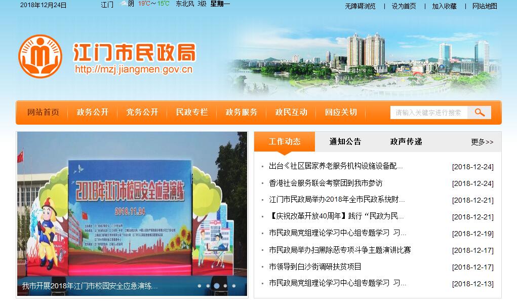 江门市民政局是主管有关社会行政事务的市人民政府工作部门。其主要职责:(一)贯彻执行国家、省和市有关民政工作的方针政策和法律法规,拟订民政工作的地方性规范性文件和参与民政事业发展规划工作,并组织实施和监督检查。(二)负责退役士兵、复员干部和军队移交地方管理的离休退休干部、退休士官和军队无军籍退休退职职工的接收安置工作,负责烈士审核申报、褒扬工作,组织和指导拥军优属工作。(三)组织自然灾害救助应急体系建设,组织协调城乡救灾工作,负责组织灾情的核查和报送,承办救灾款物的管理、分配并监督使用;组织指导救灾捐赠。(四)负责城乡居民最低生活保障、医疗救助、临时救助、流浪乞讨及生活无着人员救助工作,指导农村五保供养工作,健全城乡社会救助体系。(五)推动基层民主政治建设,指导实施城乡基层群众自治组织建设和城乡社区建设,指导城乡社区服务体系建设,负责指导基层群众自治组织和社区组织干部的表彰工作。(六)负责镇以上行政区域的设立、撤销、调整、更名、界线变更以及政府驻地迁移的审核申报工作,负责市际行政区域界线的勘定、管理和边界争议的调处事务,组织编制地名规划,负责地名命名、更名、销名的审核和地名标志管理工作,负责公开出版的全市性地名类图(册)的审批工作。(七)负责社会福利机构的监督管理,指导老年人、孤儿和残疾人等特殊群体权益保障工作,负责收养登记管理工作,组织指导社会捐助工作,促进慈善事业发展。(八)负责推进婚俗和殡葬改革,指导婚姻、殡葬、救助服务机构管理工作。(九)依法对社会团体、民办非企业单位进行登记管理和监督。(十)会同有关部门按规定拟订社会工作发展规划、政策和职业规范,推进社会工作人才队伍建设和相关志愿者队伍建设。(十一)负责管理福利彩票销售工作,负责管理、使用福利资金和民政事业费。(十二)承办市人民政府和省民政厅交办的其他事项。