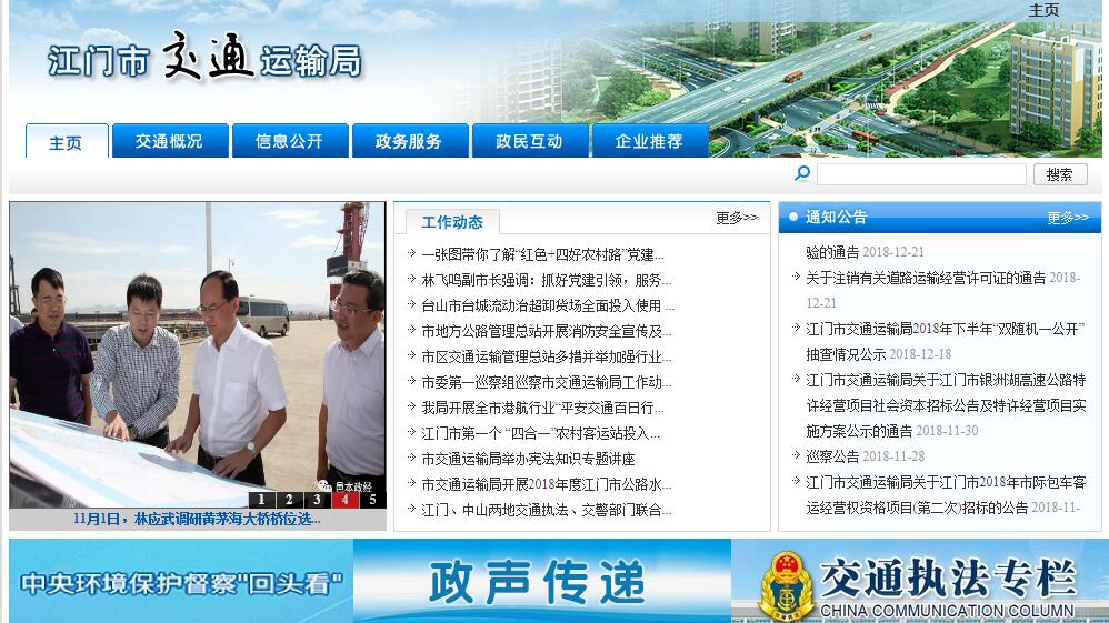 江门市交通运输局是主管江门市交通运输行业的政府组成部门,主要承担全市交通规划建设、道路水路运输、交通建设市场监管等行业管理职能。其主要职责:(一)贯彻执行国家和省有关交通运输工作的方针政策和法律法规,结合我市实际组织拟订全市交通运输行业发展战略和规划,参与拟订全市物流业发展战略、规划,指导交通运输行业有关体制改革工作。(二)负责涉及综合运输体系的规划协调工作,会同有关部门组织编制综合运输体系规划并组织实施,指导、协调交通运输枢纽规划和管理。(三)承担交通建设市场监管责任。负责公路、水路交通运输基础设施建设、管理和维护,负责交通运输基础设施工程质量、安全生产及造价的监督管理工作,承担地方铁路、轨道交通建设有关协调工作。(四)承担道路、水路运输市场监管责任。负责道路运输、水路运输、公路路政、港口行政和引航的监督管理工作,负责港航设施建设使用岸线布局的行业管理工作,负责城市公共交通监督管理工作。(五)负责全市公路车辆通行费收费站的监督管理工作,承担实施机动车辆路桥通行费年票制的组织协调和监督管理工作。(六)指导交通运输行业安全生产和应急管理工作,组织实施重点物资和紧急客货运输,负责公路、水路交通战备工作。(七)实施交通运输行业科技政策,组织重大交通科技项目攻关,指导交通运输信息化建设,指导、监督交通运输行业技术标准和规范的实施,指导交通运输行业环境保护和节能减排工作。(八)组织、协调和参与管理公路、水路交通运输行业利用外资工作,开展对外交流与合作工作。(九)承办市人民政府和省交通运输厅交办的其他事项。