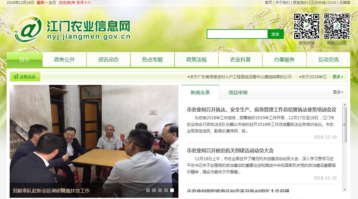 江门市农业局是主管全市农业和农村经济发展的市人民政府工作部门。于2001年6月市级党政机构改革时组建。由机构改革前的市农业委员会、农业局、畜牧局、农业机械化管理局、乡镇企业管理局和划入市扶贫办、原财贸委饲料管理办部分职能而组成。领导机构设有“中共江门市农业局党组”及“行政领导班子”。内设机构有市畜牧兽医局(畜禽屠宰管理科、市饲料工作办公室,副处级)、办公室、综合协调科、政策法规科(行政审批服务科)、农村经济体制与经营管理科、科教与信息科、种植业管理科(种子管理科)、农业机械化管理办公室(农业机械安全监督管理办公室)、农业基础建设办公室、农产品质量安全监管科(市菜篮子工程办公室、市绿色食品办公室)、计划财务管理科、人事科、市扶贫开发办公室(市老区建设办公室)、综合行政执法科(市农业综合行政执法支队、农业应急管理办公室)共1个副处级局和13个职能科室。2004年,成立中共江门市委农村工作领导小组办公室,为中共江门市委农村工作领导小组的常设办事机构,与市农业局合署办公。江门市农业局下属有9个科级事业单位,市农村财务管理办公室、市动物卫生监督所、市农产品质量监督检验测试中心、市农业环境监测站(市兽药与饲料监测所)、市农业科学研究所(市农业科技推广中心、市农作物种子种苗质量检验检测站)、市农业技术服务中心(市农业信息中心、市农民科技教育培训工作站、市农业机械化技术推广站)、市农作物病虫测报中心站(市植物保护站)、市动物疫病预防控制中心(市畜牧兽医技术推广站)、市农业科技创新中心(市水果科学技术研究所、市植物组培繁育推广中心、广东省(江门)粤台农业合作试验区管理委员会)。农业局自组建以来,在市委、市政府的领导和省农业厅的指导下认真贯彻党和国家有关农业和农村工作的路线、方针和政策,严格依法行政,热情服务“三农”,在各项工作中充分发挥了全局人员的主观能动作用,有力推动了我市农业现代化建设的进程,全市农业增效、农民增收和农村稳定工作得到了进一步的发展。在新的历史时期,农业局将全面贯彻党的十八大和十八届三中、四中、五中、六中全会及习近平总书记系列重要讲话精神,在市委、市政府的正确领导和省农业厅的指导下,全局干部职工上下团结,共同努力,认真贯彻执行党和国家的路线、方针、政策,严格依法行政,创建法治型政府机关。并按照市委、市政府关于建设学习型、服务型、廉洁型、高效型、奉献型五型机关的要求,抓好班子和队伍建设,推进政府职能转变,使全局各项工作更加适应于农业现代化建设的需要。其主要职责:(一)贯彻落实国家和省有关农业农村工作的方针政策和法律法规,组织开展农业和农村经济社会改革与发展问题的调查研究并提出政策建议,指导社会主义新农村建设和农村体制改革,综合协调市直涉农部门(单位)的有关工作。(二)拟订种植业、畜牧业、农业机械化等农业有关产业(以下简称农业)和农村经济发展政策措施并指导实施。(三)提出深化农村经济体制改革和稳定农村基本经营制度的政策建议,指导农村土地承包、耕地经营权流转、承包纠纷仲裁和农村集体资产管理,指导、监督减轻农民负担和村民筹资筹劳管理工作,拟订农业产业化经营的发展规划并组织实施,指导农业社会化服务体系、农村合作经济组织、农民专业合作社的建设与发展。(四)组织落实促进粮食、生猪等主要农产品生产发展的相关政策措施,引导农业产业结构调整和产品品质的改善,指导实施农业标准化、规模化生产,提出农业固定资产投资规模、方向和有关财政性资金安排的建议,提出扶持农业农村发展的财政政策和项目建议,拟订农业开发规划并监督实施。(五)拟订农产品加工业发展的政策措施,提出农业产业保护、促进大宗农产品流通的政策建议,参与拟订农产品专业批发市场体系建设与发展规划,培育、保护和发展农产品品牌。(六)依法开展农产品质量安全风险评估,授权发布有关农产品质量安全状况信息,负责农产品质量安全监测,依法管理农业标准化工作,指导农业检验检测体系建设,依法组织实施农产品质量安全的监督管理。(七)依法开展农作物种子(种苗)、草种、种畜禽、肥料、农药、兽药、饲料、饲料添加剂、农业转基因生物生产加工、动物防疫监督管理,负责管理农业机械化事业,组织农机推广应用,指导农业机械化服务体系建设。(八)负责动物重大疫病和农作物重大病虫害监测预警与防控,拟订动植物防疫和检疫的政策措施,指导动植物防疫和检疫体系建设,组织、监督动植物的防疫检疫工作,组织重大植物检疫性有害生物监测、普查,组织兽医医政、兽药药政工作,负责执业兽医的管理。(九)承担农业救灾复产工作,监测、发布农业灾情,组织种子、化肥等救灾物资储备和调拨,提出生产救灾资金安排建议,指导农业救灾和灾后恢复生产,承担农业重大突发事件应急管理。(十)制定农业科技、农技推广的规划和有关政策措施,指导现代农业产业技术体系和技术推广体系建设,组织实施农业科研、成果转化、科技示范和技术推广,组织引进国外农业优良品种与先进技术,负责农业科技成果管理、农业植物新品种保护和农业转基因生物安全监督管理。(十一)会同有关部门拟订农业农