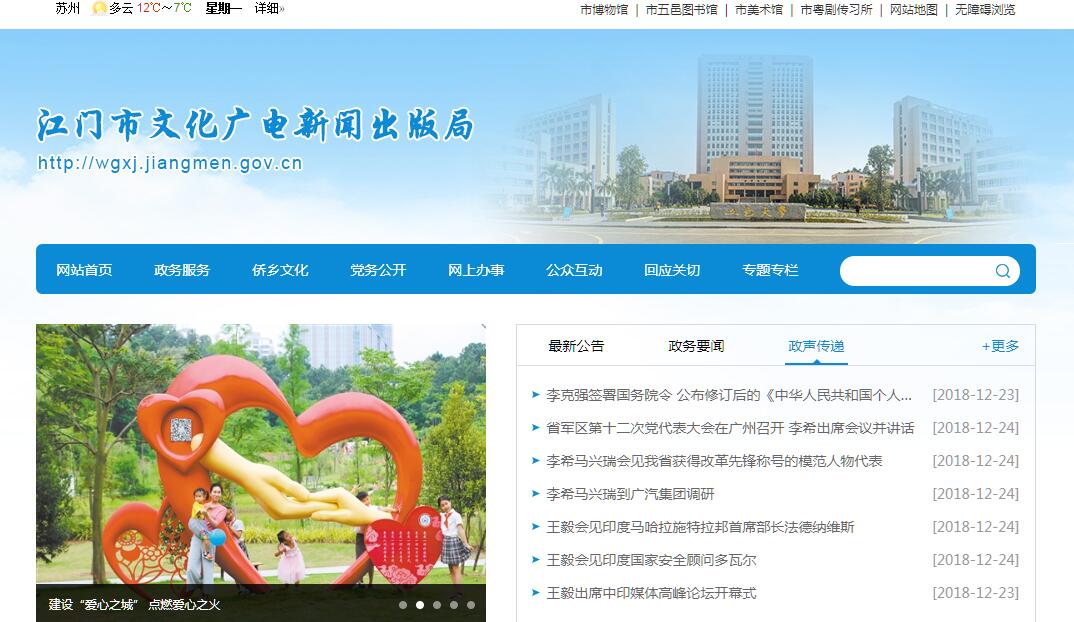 江门市文化广电新闻出版局主要职责:一、贯彻执行国家和省关于文化艺术、文物、广播电影电视、新闻出版、版权方面的方针政策和法律法规,拟订我市文化、文物、广播电影电视、新闻出版等事业和产业发展规划并组织实施。二、管理社会文化艺术、文化事业以及全市性的重大文化活动;协调、指导艺术创作和生产,推动各门类艺术的发展;指导文化科研工作、文化艺术教育工作;推进文化艺术领域的公共文化服务,引导公共文化产品生产;指导市重点文化设施和基层文化设施建设;指导图书馆、文化馆(站)、美术馆等事业和基层文化建设工作;组织协调文化遗产的管理和保护,组织实施非物质文化遗产保护和优秀民族文化的传承普及工作。三、指导、管理文物保护工作和有关文物、博物馆事业;协调文物考古调查、修复维护、安全防范等工作;组织、指导文物资源调查和利用、文物普法与宣传等工作;协调解决文物保护工作中的重大问题和文物考古项目有关工作。四、指导、监管广播电影电视节目、信息网络视听节目和公共视听载体播放的视听节目以及境外落地电视频道的传输、监测和安全播出等工作;监管境外广播电影电视节目的引进和播出;组织推进广播电影电视领域的公共服务,组织实施广播电影电视重大工程。五、负责监管出版活动和出版物内容;负责省级新闻出版行政主管部门委托申办报刊、出版社(包括音像出版社)及互联网出版的审核上报和市直内部资料性出版物的出版核发工作;负责全市报社、期刊社和驻江门记者站及发行站的有关管理工作;负责全市音像、印刷、复制、发行业及出版物市场的监管。六、负责版权管理、保护工作;贯彻相关产业政策、组织推进软件正版化工作;监管出版活动,组织开展对非法出版物、违禁出版物的鉴定工作;监督、指导版权贸易、登记工作;调解版权纠纷。七、指导文艺演出、文化娱乐、互联网文化、动漫、网络游戏、文化艺术品等有关文化市场管理工作;扶持和促进文化产业建设和发展。八、指导监督全市有关文化市场综合行政执法工作;组织、协调全市文化市场行政执法专项行动;负责大案、要案、跨区域案件和敏感案件的执法活动;协调指导全市文化市场综合行政执法队伍建设;负责对有关文化市场经营活动和从事演艺活动、广播电影电视节目制作、出版活动的民办机构进行监管。九、组织开展文化艺术、文物、广播电影电视、新闻出版、版权方面的对外交流与合作。十、承担市文化市场管理工作领导小组(市“扫黄打非”领导小组)日常工作。十一、承办市委、市政府和省有关业务主管部门交办的其他事项。