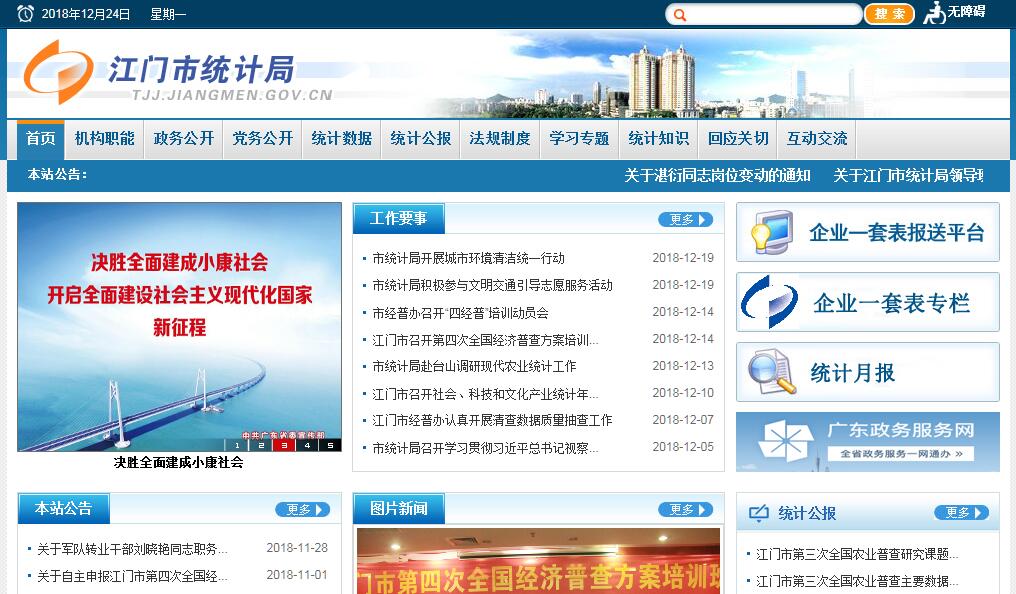 江门市统计局主要职责:(一)贯彻执行国家和省有关统计工作的方针政策、方法制度和法律法规,拟订统计工作规划和调查计划并组织实施;承担组织和协调全市统计工作,确保统计数据真实、准确、及时的责任;监督检查统计法律、法规和制度的实施,指导全市统计工作。(二)组织实施全市国民经济核算制度和投入产出调查,执行国家和省的统计标准和基本统计报表制度,拟订适合我市经济、社会发展的地方统计调查项目和调查方案并组织实施,核算全市及各市(区)生产总值,汇编提供国民经济核算资料,监督管理全市国民经济核算工作。(三)会同有关部门拟订重大市情市力普查计划、方案,组织实施全市人口、经济、农业等重大市情市力普查,汇总、整理和提供有关市情市力方面的统计数据,对国民经济、社会发展和科技进步等情况进行统计分析、统计预测和统计监督,向市委、市政府及有关部门提供统计信息和咨询建议。(四)组织实施农林牧渔业、工业、建筑业、批发和零售业、住宿和餐饮业、房地产业等统计调查,收集、汇总、整理和提供有关调查的统计数据,综合整理和提供旅游、对外经济、交通运输、邮政、教育、卫生、社会保障、公用事业等全市性基本统计数据。(五)组织实施能源、投资、科技、人口、劳动力、社会发展基本情况等统计调查,收集、汇总、整理和提供有关调查的统计数据。(六)组织全市及各市(区)、市直各部门的经济、社会、科技和资源环境统计调查,统一核定、管理、公布全市性基本统计资料,定期发布全市国民经济和社会发展情况的统计信息,组织建立服务业统计信息共享和发布制度。(七)依法审批或备案全市及各市(区)、市直各部门统计调查项目,指导统计基层建设和统计基础工作规范化建设,组织建立服务业统计信息管理制度,建立健全统计数据质量审核、监控和评估制度,开展对重要统计数据的审核、监控和评估。(八)协助管理各市(区)统计局局长和副局长,指导全市统计专业技术队伍建设,会同有关部门组织管理全市统计专业技术资格考试、职务评聘、从业资格认定工作,组织指导全市统计人员教育和业务培训。(九)建立健全和管理全市统计信息自动化系统和数据库系统,指导各市(区)、市直各部门统计数据库和网络的基本标准和运行规则的实施工作,指导全市统计信息化系统建设。(十)承办市人民政府和省统计局交办的其它事项。