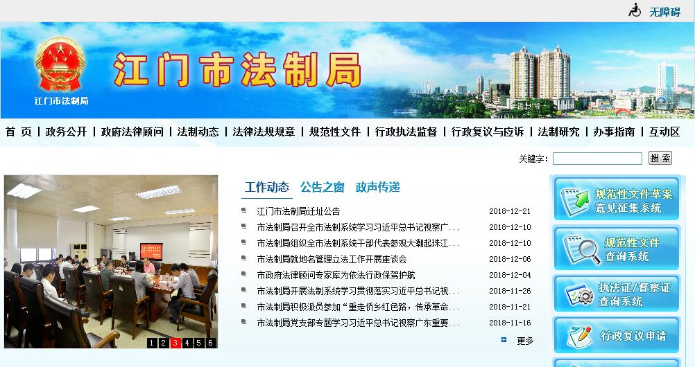 江门市法制局主要职责:(一)贯彻执行国家有关法制工作的方针政策,督促指导全市依法行政工作,调查研究依法行政工作中出现的新情况、新问题,提出推进依法行政的措施和建议。(二)承担统筹规划市人民政府立规工作的责任,组织编制并实施中长期立规规划和年度立规计划,负责市人民政府规范性文件的报送、备案、立规解释工作。(三)负责起草、修改、审核市人民政府规范性文件草案,承担市人民政府部门规范性文件的合法性审查和各市、区人民政府规范性文件的备案审查责任,办理公民、法人和其他组织对规范性文件提出的合法性审查申请事项,监督、指导全市规范性文件审查、审核、评估、清理及编纂工作,承办上级交办的法律、法规、规章草案征求意见工作。(四)承担行政执法监督的责任,建立、完善和组织实施行政执法督察制度,审查行政执法队伍主体和人员的执法资格,监督使用广东省人民政府《行政执法证》,组织行政执法人员法律培训,负责行政执法投诉举报和行政执法争议协调处理工作。(五)办理向市人民政府申请的行政复议、行政赔偿案件,代理市人民政府行政应诉事务,监督、指导全市行政复议、行政应诉和行政赔偿工作。(六)负责市人民政府法律顾问事务,承办市人民政府重大决策、重要行政措施发布前的合法性审查、重大合同的审核及市政府领导同志交办的法律事务,协调或代理市人民政府民事诉讼事务。(七)指导市政府各部门,各市、区政府有关政府法制工作,开展政府法制理论、政府法制工作研究和宣传及对外法制业务交流。(八)承办市人民政府和省人民政府法制办公室交办的其他事项。