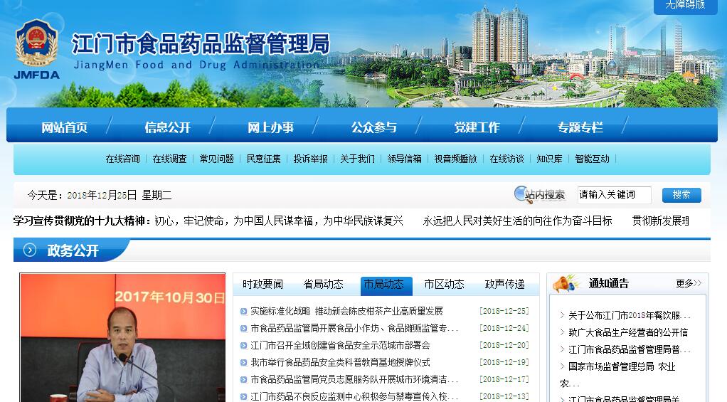 江门市食品药品监督管理局主要职责:(一)贯彻执行国家、省有关食品(含食品添加剂、保健食品、酒类食品,下同)安全、药品(含中药、民族药,下同)、医疗器械、化妆品监督管理的方针政策和法律法规以及市有关工作部署,推动建立落实食品药品安全企业主体责任、地方政府负总责的机制,建立食品药品重大信息直报制度,并组织实施和监督检查,着力防范区域性、系统性食品药品安全风险。(二)负责食品安全监督管理,组织实施食品安全管理规范。建立食品安全隐患排查治理机制,贯彻落实国家、省食品安全检查年度计划、重大整顿治理方案。指导并组织开展食品安全宣传和信息发布工作,统一发布重大食品安全信息;组织开展食品安全重大专项治理和综合检查。参与制定食品安全风险监测计划,根据食品安全风险监测计划开展食品安全风险监测工作。(三)监督实施国家药典等药品和医疗器械标准、分类管理制度。监督实施药品和医疗器械研制、生产、经营、使用质量管理规范。负责医疗器械注册有关工作并监督检查。建立药品不良反应、医疗器械不良事件监测体系,并开展监测和处置工作。配合有关部门实施国家基本药物制度。负责药品、医疗器械、化妆品行政许可和监督管理,组织实施相关质量管理规范。(四)负责制定全市食品、药品、医疗器械、化妆品监督管理的稽查制度并组织实施,负责监测互联网药品信息服务和交易行为;组织查处跨区域或者重大违法行为。监督实施问题产品召回和处置制度。(五)负责食品药品安全事故应急体系建设,组织和指导食品药品安全事故应急处置和调查处理工作,监督事故查处落实情况。(六)负责放射性药品、麻醉药品、医疗用毒性药品、精神药品、药品类易制毒化学品等特殊药品(以下称特殊药品)监督管理。(七)负责制定全市食品药品安全科技发展规划并组织实施,推动食品药品检验检测体系、电子监管追溯体系和信息化建设。(八)监测药品、医疗器械和保健食品广告。(九)负责开展食品药品安全宣传工作、教育培训、对外交流与合作。推进诚信体系建设。(十)指导市(区)食品药品监督管理工作,规范行政执法行为,完善行政执法与刑事司法衔接机制。(十一)指导食品、药品、医疗器械、化妆品的科研实验、临床试验和检验工作,并指导药品不良反应监测机构和审评认证机构的业务工作。(十二)承担市食品安全委员会日常工作,负责食品安全监督管理综合协调,推动健全协调联动机制。督促检查有关部门和市(区)人民政府履行食品药品安全监督管理职责并负责考核评价。(十三)承办市人民政府、市食品安全委员会和省食品药品监督管理局交办的其他事项。