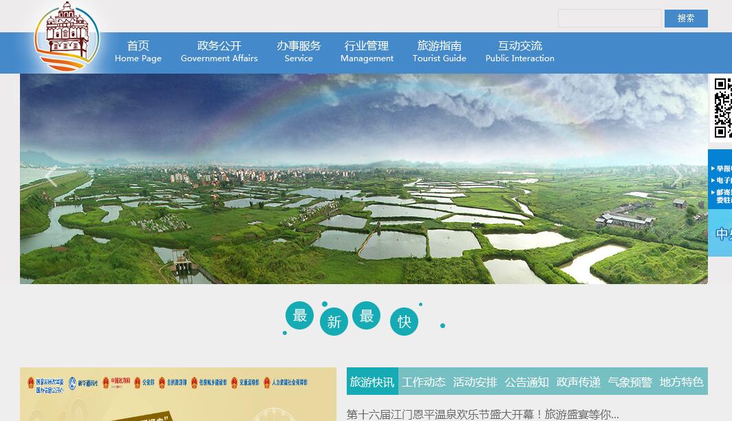 江门市旅游局是市人民政府主管旅游业的工作部门,主要职能是:(一)贯彻执行国家和省有关旅游工作的方针政策和法律法规,拟订旅游业管理办法并监督实施,研究和推进旅游综合改革。(二)制定国内旅游、入境旅游和出境旅游市场开发战略并组织实施,组织江门旅游整体形象对外宣传和重大推广活动,负责国内、国际旅游合作与交流事务。(三)组织市内旅游资源的普查工作,协调有关部门做好旅游资源的规划、保护和开发工作,引导旅游业社会投资和旅游产品开发,监测旅游经济运行,负责全市旅游统计工作。(四)协调管理旅游服务质量和市场秩序,组织实施旅游区、旅游设施、旅游服务、旅游产品等方面的标准工作,依法负责有关旅游业务的审核、审批工作和出入境旅游管理工作,指导旅游行业精神文明建设和诚信体系建设,指导行业组织的业务工作。(五)协调旅游安全、旅游应急救援、节假日旅游工作,引导休闲度假,协调和推动国民旅游休闲计划实施。(六)会同有关部门做好赴港澳台旅游政策的组织实施工作,开展对港澳台旅游市场推广工作,承办赴港澳台旅游的有关事务和其他江港澳台旅游合作交流事务。(七)制定并组织实施旅游人才规划,指导旅游教育培训工作,会同有关部门指导实施旅游从业人员的职业资格标准和等级标准工作。(八)承办市人民政府和省旅游局交办的其他事项。