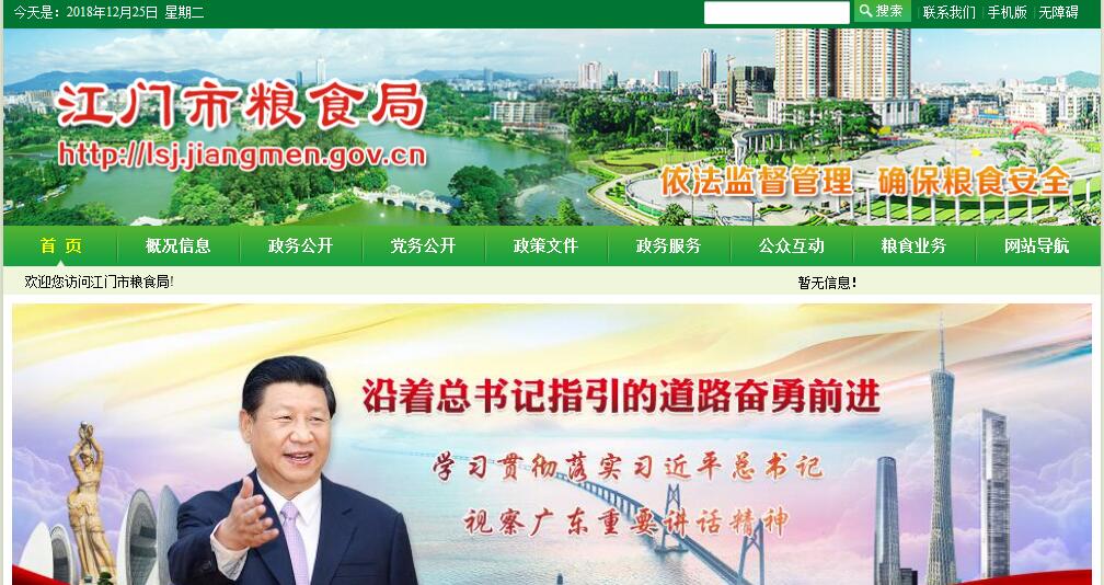 江门市粮食局主要职责:(一)贯彻执行国家和省有关粮食工作的方针政策和法律法规,依法监督相关方针政策和法律法规的执行情况和全社会粮食流通情况;受市国资委的委托,对市直国有粮食企业进行管理。(二)研究提出全市粮食宏观调控、总量平衡以及粮食流通的中长期规划,会同有关部门提出地方储备粮规模、品种布局和动用本级储备粮的建议;指导开展粮食产销合作,推动粮食流通产业发展。(三)监测分析粮食供求、生产、消费、价格形势,承担粮食监测预警和应急责任,负责全市粮食宏观调控的具体工作,保障粮食安全。(四)负责市级储备粮的行政管理,提出并组织实施粮食储备布局规划;指导各市、区做好储备粮轮换和储备粮品种结构调整,监督检查储备粮油的数量、质量和储存安全;负责对粮食收购、储存环节的粮食质量安全和原粮卫生进行监督管理。(五)指导全市粮食市场体系建设,会同有关部门拟订粮食市场体系建设发展规划;拟订粮食流通设施建设规划,指导全市粮油仓库维修改造,建立并完善粮食市场信息网络。(六)负责全市粮食流通行业管理,指导粮食行业科技进步、技术创新和新技术推广,负责军粮供应管理工作。(七)负责实施粮食财会会计制度、汇编财务报表;指导、监督粮食系统财会工作,负责粮油统计报表工作;会同有关部门管理粮食各项专项补贴资金。(八)承办市政府、省粮食局和市发展改革局交办的其他事项。