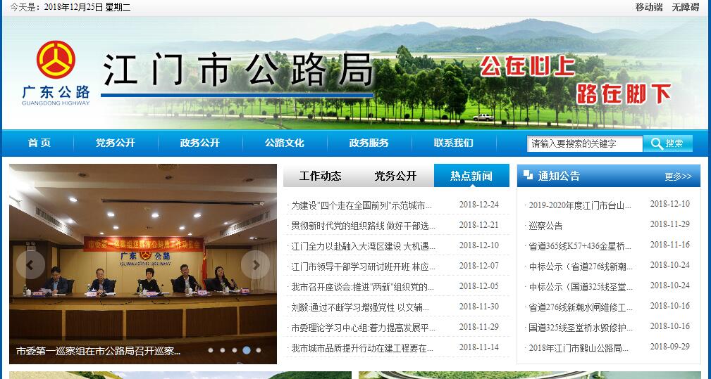 | 网站简介: 江门市公路局主要职责:一、贯彻执行国家和省有关公路管理工作的方针政策和法律法规,对所管辖的公路行使公路行政管理职责。二、参与拟订全市公路发展规划;承担所管辖公路、桥梁及其附属物的建设、养护监管、路网运行调度等管理工作。三、按照分级分类管理的规定,负责所管辖公路建设、改造项目的审核工作及安全生产的监督管理工作;参与承建公路的建设、改造项目的交工、竣工验收;参与有关高速公路的建设管理工作。四、负责代市政府征收汽车通行费(年票)工作;负责所管辖公路养护资金的使用和监管。五、负责所管辖公路及相关收费公路的路政管理工作,检查、制止侵占或者损坏路产路权等违反《中华人民共和国公路法》、《公路安全保护条例》和《广东省公路条例》的行为。六、负责公路信息化建设;负责公路科学技术项目的管理及成果推广应用;指导本系统的精神文明建设和行风建设;组织实施创建文明样板路工作。七、组织实施所管辖公路交通战备、应急养护和抢险工作。八、承办市政府以及上级主管部门交办的其他事项。 |