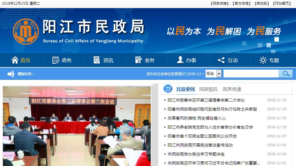 阳江市民政局主要职责:(一)贯彻执行国家有关民政工作的方针政策和法律法规,起草有关地方性法规、规章草案,拟订民政事业发展规划和相关的民政政策,并组织实施和监督检查。(二)负责退役士兵、复员干部和军队移交地方管理的离退休干部、退休士官和军队无军籍退休退职职工的接收安置工作;负责烈士报批、褒扬工作;组织和指导拥军优属工作。(三)负责组织、协调城乡救灾工作,组织自然灾害救助应急体系建设,负责组织核查并统一发布灾情,管理、分配救灾款物并监督使用,组织、指导救灾捐赠。(四)负责城乡居民最低生活保障、医疗救助、临时救助、流浪乞讨及生活无着人员救助工作,健全城乡社会救助体系。(五)负责县(市、区)、镇、街道的设立、撤销、调整、更名、界线变更以及政府驻地迁移的审核报批工作,负责行政区域界线的勘定和管理,负责边界争议的调处事务,组织编制地名规划,负责地名命名、更名、销名审核工作,规范地名标志设置和管理工作。(六)提出加强和改进城乡基层政权建设的建议,推动基层民主政治建设,指导实施城乡基层群众自治组织建设和城乡社区建设,指导城乡社区服务体系建设。(七)负责社会福利机构的监督管理,促进慈善事业发展,组织指导社会捐助工作,指导老年人、孤儿和残疾人等特殊群体权益保障工作。(八)负责推进婚俗和殡葬改革,负责收养登记管理工作,指导婚姻、殡葬、收养、救助服务机构管理工作。(九)承担依法对社会团体、基金会、民办非企业单位进行登记管理和监察的责任。(十)会同有关部门按规定拟订社会工作发展规划、政策和职业规范,推进社会工作人才队伍建设和相关志愿者队伍建设。(十一)负责管理福利彩票销售工作,负责管理、使用、发放福利资金和民政事业费。(十二)承办市人民政府和省民政厅交办的其他事项。
