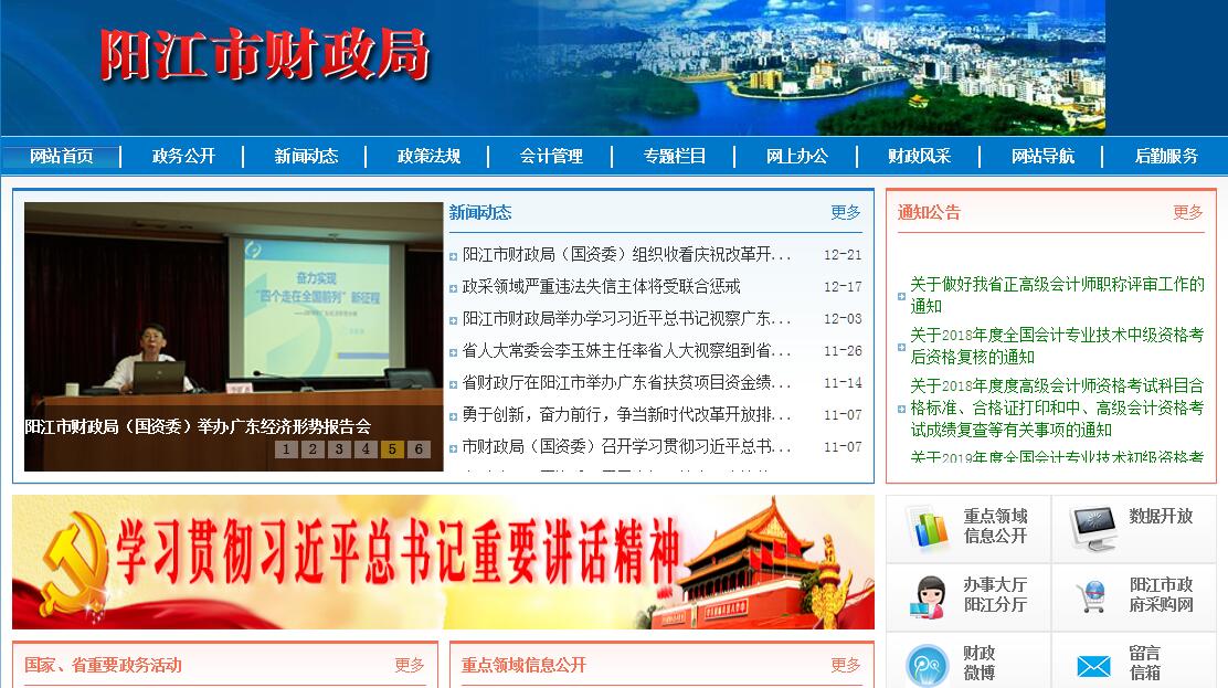 阳江市财政局主要职责:(一)贯彻执行国家、省、市有关财政、税收工作的方针政策和法律法规。组织拟订财政、政府采购、国有资产管理、资产评估、财务会计、政府债务管理等方面的地方性规定和办法,并监督实施;参与拟订有关税收政策。(二)拟订财政发展战略、中长期财政规划,参与分析预测经济形势,参与制定各项经济政策,提出运用财税政策实施宏观调控、综合平衡社会财力和推进基本公共服务均等化及主体功能区规划的建议,执行中央与地方、国家与企业的分配政策。(三)承担市级各项财政收支管理的责任。负责编制年度市级预决算草案并组织执行;受市人民政府委托,向市人民代表大会报告市级和全市预算及其执行情况,向市人民代表大会常务委员报告决算;制定行政事业单位开支标准、定额,审核批复市级部门(单位)的年度预决算,完善转移支付制度。(四)制定全市财政和预算收入计划,管理和监督各项财政收入,负责组织耕地占用税、契税的征收和管理。(五)负责市级非税收入及各项政府性基金管理。拟订彩票管理制度,监管彩票市场,按规定管理彩票资金;管理政府债务、政府主权债务,防范财政风险;管理财政票据,管理财政预算内行政机构、事业单位和社会团体的非贸易外汇,监督行政事业单位住房基金使用,参与监管住房保障和住房公积金。(六)组织制定市级国库管理制度、国库集中收付制度及财政总预算会计核算制度,负责市级财政资金调度和财政总预算会计工作,制定政府采购政策、制度并监督管理,监管市级行政事业单位会计核算工作。(七)负责制定行政事业单位国有资产管理制度。负责本级行政事业单位和行政单位未脱钩经济实体、事业单位创办的具有法人资格的企业等国有资产监管;组织拟订国有资本经营预算制度,负责市级国有资本经营预算编制、执行和监督,负责市属金融国有资产管理;组织开展企业、行政事业单位等会计决算报表及公共资源统计分析评价工作。(八)负责各项市级财政专项资金的安排和监督管理,拟订重要物资储备的财政政策,编制市级社会保障预决算草案并组织执行,管理市级财政社会保障支出,监管社会保障资金,拟订社会保障资金财务制度、基本建设财务制度、企业财务制度和农村财务制度。(九)参与财政性资金项目安排问题研究,组织调度财政性基本建设资金,参与审核财政性资金投资项目工程概算,承担财政性资金投资项目工程预算、结算和竣工财务决算审核工作,对财政性资金建设项目实施财务监管,负责制定代建项目财务管理制度,参与工程造价管理,负责农业综合开发管理工作。(十)监督检查财税等方面法律法规和政策的执行情况,检查、处理、反映财政收支管理中的重大问题,提出加强财政管理的政策建议,承担财政支出绩效管理工作。(十一)管理全市会计工作,依法指导和监督注册会计师和会计师事务所的业务,指导和管理社会审计工作,依法监管外国及港澳台地区会计师事务所在本市境内的有关业务。(十二)管理资产评估行业,指导和监督评估机构和注册评估师的业务,办理监管范围内涉及国有产权权益的资产评估项目备案和核准。(十三)根据国家现行企业国有资产管理体制的要求,代表市人民政府履行国有企业出资人职责,对市属国有企业实行权利、义务和责任相统一,管资产和管人、管事相结合的国有资产管理体制,维护所有者权益,指导推进国有及国有控股企业的改革和重组,依照法定程序对所出资企业负责人进行任免和提出任免建议,对出资企业负责人进行考核,并根据考核结果对其进行奖惩,通过各种方式对企业国有资产保值增值情况进行监管。(十四)承办市人民政府和省财政厅交办的其他事项。