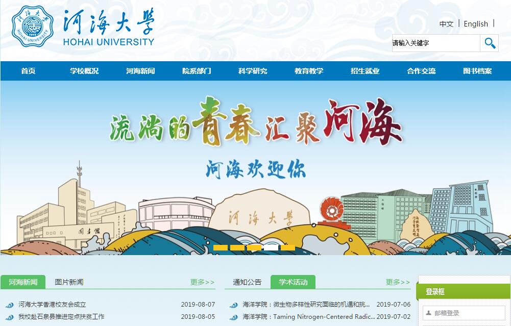 河海大学是一所拥有百年办学历史,以水利为特色,工科为主,多学科协调发展的教育部直属全国重点大学,是实施国家“211工程”重点建设、国家优势学科创新平台建设、一流学科建设以及设立研究生院的高校。一百年来,学校在治水兴邦的奋斗历程中发展壮大,被誉为“水利高层次创新创业人才培养的摇篮和水利科技创新的重要基地”。学校在南京市、常州市设有西康路校区、江宁校区和常州校区,占地面积2579亩。河海大学,源于1915年由近代著名教育家、实业家张謇创办的河海工程专门学校,是中国第一所培养水利人才的高等学府,开创了中国水利高等教育的先河。张闻天、沈泽民等无产阶级革命家曾在河海求学,并从这里走上革命道路。1924年与东南大学工科合并成立河海工科大学,1927年并入第四中山大学,后更名为中央大学、南京大学。1952年,南京大学水利系与交通大学、同济大学、浙江大学等高校的水利系科以及华东水利专科学校组建华东水利学院,钱正英为首任院长。1960年,学校被中共中央认定为全国重点高校。1985年恢复传统校名“河海大学”,邓小平同志亲笔题写了校名。河海大学设有水文水资源学院、水利水电学院、港口海岸与近海工程学院、土木与交通学院、环境学院、能源与电气学院、计算机与信息学院、机电工程学院、物联网工程学院、力学与材料学院、地球科学与工程学院、农业科学与工程学院、海洋学院、理学院、商学院、企业管理学院、公共管理学院、法学院、马克思主义学院、外国语学院、体育系等专业院系和大禹学院(拔尖人才培养学院)、国际教育学院、远程与继续教育学院。截止2017年9月底,各类学历教育在校学生51419名,其中研究生16493名,普通本科生19870名,成人教育学生13874名,留学生1182名。河海大学现有教职工3441名,具有高级职称的教师1354名,博士生导师483名;现有中国工程院院士2名,双聘院士15名。“中组部海外高层次人才引进计划(千人计划)”入选者14名,教育部“长江学者奖励计划”特聘教授7名,国家杰出青年科学基金获得者7名,国家优秀青年科学基金获得者4名,“国家级教学名师奖”获得者3名,国家级有突出贡献的中青年专家9名,“百千万人才工程”国家级人选11名,教育部“新世纪优秀人才支持计划”入选者23名,教育部科技委学部委员2名,江苏省有突出贡献中青年专家11名,入选江苏省“333高层次人才培养工程”、江苏省高校“青蓝工程”等省级人才计划培养对象逾300人次。国家自然科学基金委创新群体1个,“长江学者和创新团队发展计划”创新团队5个、国家级教学团队2个,“江苏高等学校优秀科技创新团队”6个、江苏省哲学社会科学优秀创新团队2个,“青蓝工程”科技创新团队9个。河海大学是国家首批授权授予学士、硕士和博士学位的高校之一。2016年教育部组织的学科评估中,学校水利工程学科获评A+。“工程学”“环境/生态学”“计算机科学”“材料科学”学科进入 ESI 世界排名前 1%,拥有1个一级学科国家重点学科(水利工程),7个二级学科国家重点学科,2个二级学科国家重点学科培育点, 15个一级学科省级重点学科;15个博士后流动站;16个一级学科博士点,77个二级学科博士点;38个一级学科硕士点,205个二级学科硕士点;12种硕士专业学位类别,其中工程硕士专业学位涉及19个工程领域;56个本科专业。河海大学坚持务实重行的教育传统,培养了20余万名毕业生。温家宝总理2005年视察学校时指出,“分布在全国各地水利战线和水电战线的技术骨干,很多都是河海大学学生。新中国的水利和水电事业的发展,是同我们这里输送的大批的人才分不开的”。学校始终坚持本科教学的基础地位,以“宽基础,强实践,重创新”为导向,大力推进本科教学工程,获国家级教学成果奖10项、省级教学成果奖73项,建有国家级实验教学示范中心3个,国家虚拟仿真实验教学中心1个,拥有国家级专业综合改革试点项目3个,国家级卓越工程师教育培养计划学科专业5个,国家级工程实践教育中心4个,国家特色专业建设点13个,国家精品视频公开课9门,国家精品资源共享课12门。多年来,毕业生就业率始终保持在96%以上。2005年,以优秀的成绩通过教育部本科教学工作水平评估。研究生教育规模快速发展,人才培养模式改革不断深化,培养质量持续提高,专业学位研究生综合改革走在全国前列。河海大学发挥多学科综合优势,面向国家重大工程关键技术问题,强化科研特色和提高集成创新能力,推进协同创新,服务于国家经济建设和社会发展。学校拥有水文水资源与水利工程科学国家重点实验室和水资源高效利用与工程安全国家工程研究中心,9个国家级以及省部级重点实验室,17个国家级以及省部级工程研究中心,5个高等学校学科创新引智基地。紧密结合三峡、黄河小浪底、南水北调、西部水电开发等重大工程建设,承担了一大批国家层面重点、重大研究计划和重点、重大工程科研项目。2000年以来,获国家级科技成果奖40余项,部省级科技成果奖740余项。学校面向国家水安全和区域经济社会发展的战略需求,积极培育水安全与水科学国家级协同创新中心,立项建设江苏省高校协同创新中心4个。河海大学实施国际化发展战略,国际交流与合作广泛开展。学校是国家首批授权可授予外国留学生博士、硕士、学士学位的高校,已为100多个国家