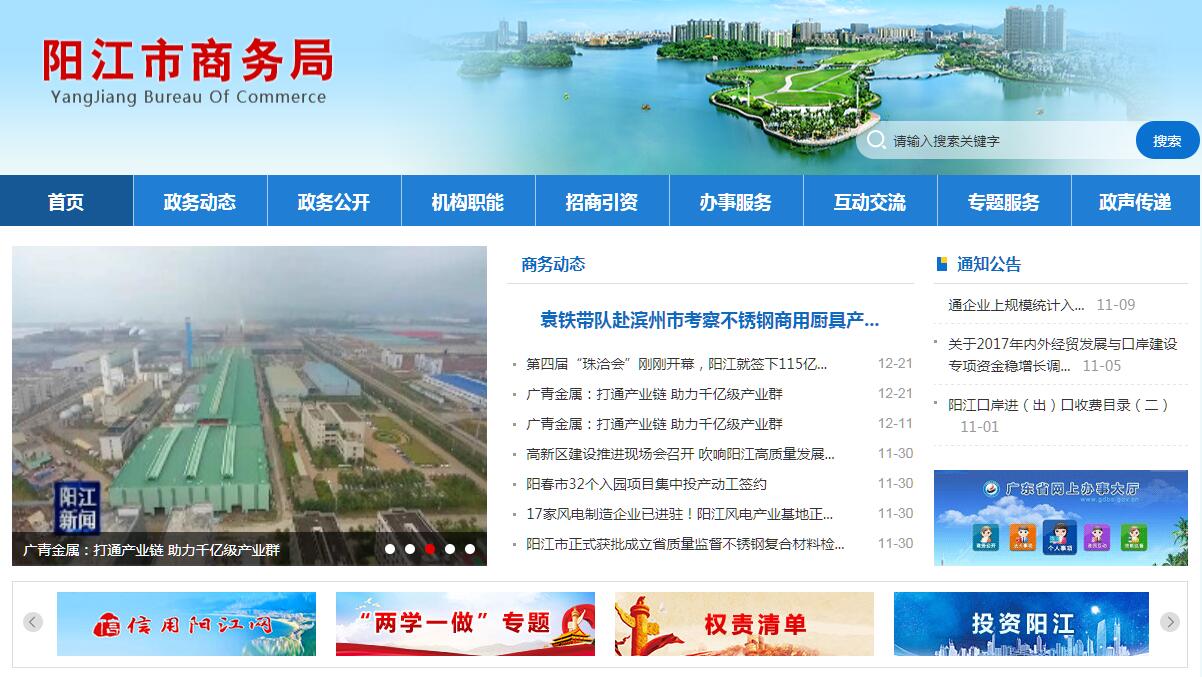 阳江市商务局主要职责:(一)贯彻执行国家和省商务管理及口岸工作有关方针政策和法律法规,起草有关规范性文件并组织实施;研究国内外贸易、现代流通方式的发展趋势并提出政策建议。(二)拟订全市商务和口岸发展战略、规划、计划并组织实施;拟订市场体系建设、内外贸易发展、投资的政策措施并组织实施,加快推进现代市场体系建设,推动商贸服务平台建设;推进内外贸融合发展;优化商贸流通产业布局和结构。(三)贯彻执行有关健全和规范城乡市场发展的政策;建立市场诚信公共服务平台,推动商务领域信用建设;推进农村市场体系建设,指导大宗产品批发市场规划和城市商业网点规划、商业体系建设;促进商贸流通体制改革,协调解决商贸流通中的重大问题;推进流通标准化。(四)负责整顿和规范市场经济秩序的相关协调工作;拟订并组织实施规范市场运行、流通秩序的政策措施;监测分析商务运行态势、商品供求,进行预测预警和信息引导;负责建立健全生活必需品市场供应应急管理机制;负责重要消费品储备的管理和市场调控工作。(五)组织实施有关会展、电子商务、商务服务等发展规划和政策措施;推进连锁经营、商业特许经营、物流配送等现代流通方式发展;促进贸易增长方式转变,指导和协调贸易促进体系建设,推动电子商务服务体系和平台建设;促进商贸中小企业发展,指导商品贸易结构调整;推动流通业品牌建设。(六)组织实施有关流通业产业政策,提出优化产业布局、结构的政策建议;负责流通行业发展工作,指导和管理再生资源回收相关工作;依法对拍卖、典当、租赁、汽车流通、旧货流通等流通行业进行监督管理;组织实施进出口商品目录;组织实施重要工业品、原材料和重要农产品(除粮食、棉花外)进出口计划以及进出口商品配额、关税配额计划。(七)牵头拟订全市服务贸易发展计划,负责商贸服务业(含批发、零售、家政、餐饮、住宿业等)管理、发展相关工作;指导服务贸易领域的对外开放;会同有关部门制定促进服务出口和服务外包发展的规划、政策措施并组织实施;推动服务外包平台建设。(八)拟订并组织实施优化机电产品、高新技术产品进出口结构和对外技术贸易的政策措施;组织实施科技兴贸战略和国际品牌建设;负责监督协调机电产品国际招投标;推进进出口贸易标准化。(九)拟订本市招商引资、对外投资规划、计划并组织实施;承担重大项目对外招商和跟踪服务工作;负责协调和指导本市招商引资、投资促进工作;负责对外投资管理和服务工作;参与制定本市促进投资规划和改善投资环境的政策措施。(十)负责国内外经济合作和对外援助工作;拟订并组织实施有关经济合作的政策措施和管理办法;依法管理、监督和服务对外承包工程、对外劳务合作等对外经济合作业务;指导和监督检查本市承担的对外援助相关工作。(十一)指导全市外商投资工作,组织实施有关外商投资政策,拟订有关改革方案并组织实施,依法管理外商投资企业和项目有关事项,依法监督检查外商投资企业执行有关法律法规情况并协调解决有关重大问题;指导加工贸易工作,依法监督管理本市加工贸易进出口工作。(十二)负责有关开发区建设发展的规划计划的政策引导和协调、指导和管理工作;组织实施与自由贸易区相关战略;负责有关开发区情况汇总、评价工作;研究分析有关开发区建设中的重大问题。(十三)拟订全市商务交流计划并组织实施;负责全市性商务和口岸的重要外事活动;指导本系统外事和对外交流工作;推进海外经贸网络规划布局;负责粤港、粤澳及对台经贸工作;组织落实区域经贸合作、协作相关工作。(十四)负责口岸建设和对外开放规划并组织实施;综合协调和指导县(市、区)口岸管理机构的工作,负责电子口岸建设及口岸信息发布;参与协调口岸安全管理。(十五)承担组织协调反倾销、反补贴、保障措施及其他进出口公平贸易相关工作;综合协调本市有关世界贸易组织事务的具体工作;依法组织产业损害调查及其他贸易救济措施,指导协调国外对本市出口商品的反倾销、反补贴、保障措施的应诉工作;依法对经营者集中行为的调查及其他反垄断相关工作。(十六)承办市人民政府和省商务厅、口岸主管部门交办的其他事项。