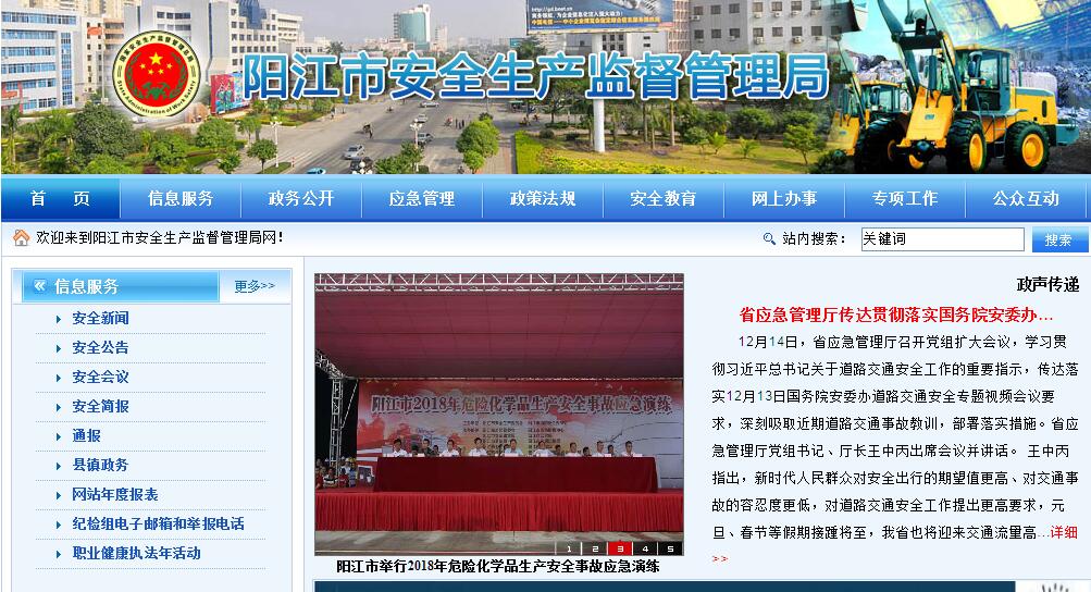 阳江市安全生产监督管理局主要职责:(一)贯彻执行国家和省、市有关安全生产工作的方针政策和法律法规规章,组织起草有关规范性文件,拟订安全生产规划,指导协调全市安全生产工作,分析和预测全市安全生产形势,发布全市安全生产信息,协调解决安全生产工作中的重大问题。(二)承担市人民政府安全生产综合监督管理的责任。依法行使综合监督管理职权,指导协调、监督检查市人民政府有关部门和各县(市、区)人民政府安全生产工作,监督考核并通报安全生产控制指标执行情况,负责组织全市性安全生产大检查和专项督查,依法组织较大生产安全事故调查处理和办理结案工作,监督事故查处和责任追究落实情况。(三)负责监督管理职责范围内的工矿商贸企业安全生产工作。按照分级、属地原则依法监督检查工矿商贸生产经营单位贯彻执行安全生产法律法规情况及其安全生产条件和有关设备(特种设备除外)、材料的安全生产管理工作,承担劳动防护用品和安全标志的安全监督检查工作。(四)承担非煤矿矿山企业和危险化学品生产经营单位安全生产准入管理的责任。依法组织并指导监督安全生产准入制度的实施,负责危险化学品安全生产监督管理综合工作和烟花爆竹经营安全生产监督管理工作。(五)承担工矿商贸作业场所职业卫生监督检查的责任,依法负责职业卫生安全许可证的颁发管理工作,组织查处职业危害事故和违法违规行为。(六)组织本市工矿商贸行业实施有关安全生产标准和规程,监督检查重大事故隐患排查治理工作,在职责范围内依法查处安全生产违法违规行为。(七)负责组织指挥和协调安全生产应急救援工作,综合管理全市生产安全伤亡事故和安全生产行政执法统计分析工作。(八)负责监督检查职责范围内新建、改建、扩建工程项目的安全设施与主体工程同时设计、同时施工、同时投产使用(简称“三同时”)情况。(九)组织指导并监督特种作业人员(特种设备作业人员除外)的考核工作和工矿商贸生产经营单位主要负责人、安全生产管理人员的安全资格考核工作,监督检查工矿商贸生产经营单位安全生产培训工作,开展安全生产宣传教育工作。(十)指导协调全市安全生产检测检验工作,监督管理本市的安全生产社会中介机构。(十一)组织指导协调和监督全市安全生产行政执法工作。(十二)组织拟订安全生产科技规划,指导协调安全生产科学技术研究和推广工作。(十三)开展安全生产方面的交流与合作。(十四)承担市安全生产委员会的日常工作。(十五)承办市人民政府和省安全生产监督管理局交办的其他事项。