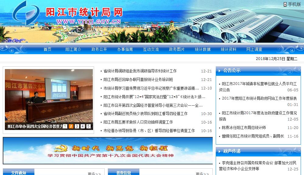 阳江市统计局主要职责:(一)贯彻执行国家和省有关统计工作的方针政策、方法制度和法律法规;拟订和实施全市统计工作规划和调查计划;组织指导全市统计工作;监督检查统计法律、法规和规章制度的实施。(二)组织实施国民经济核算制度和投入产出调查,核算全市及各县(市、区)生产总值,汇编提供国民经济核算资料,监督管理全市及各县(市、区)国民经济核算工作。(三)组织实施全市人口、经济、农业等重大市情市力普查;汇总、整理和提供有关市情市力方面的统计资料。(四)组织实施农林牧渔业、工业、建筑业、批发和零售业、住宿和餐饮业、房地产业等统计调查,收集、汇总、整理和提供有关调查的统计数据,综合整理和提供地质勘查、旅游、对外经济、交通运输、邮政、教育、卫生、社会保障、公用事业等全市性基本统计数据。(五)组织实施能源、投资、科技、人口、劳动力、农村住户、社会发展基本情况等统计调查,收集、汇总、整理和提供有关调查的统计数据,加强对全市节能降耗工作的监测与分析。(六)组织协调全市各地、各部门开展经济、社会、科技和资源环境统计调查,统一核定、管理、公布全市性基本统计资料,定期发布全市国民经济和社会发展情况的统计信息,向社会各界提供统计咨询服务;组织建立文化产业统计、现代产业和服务业统计信息共享和发布制度。(七)对国民经济、科技进步、社会发展等情况进行统计分析、统计预测和统计监督,向上级统计主管部门和市委、市政府及有关部门提供统计信息和咨询建议。(八)依法审批或备案全市各地、各部门统计调查项目,指导统计专业统计基础工作、统计基层业务建设和统计基础工作规范化建设,组织实施统计信息管理制度,建立健全统计数据质量审核、监控和评估制度,开展对重要统计数据的审核、监控和评估,依法管理全市涉外调查活动。(九)协助管理县级政府统计部门的局长、副局长,指导全市统计专业技术队伍建设,会同有关部门组织管理统计专业技术资格考试工作、职务评聘、从业资格认定工作,组织全市统计人员教育和业务培训。(十)建立并管理全市统计信息自动化系统和统计数据库系统,指导全市统计数据库和网络的基本标准和运行规则的实施工作,指导全市统计信息化系统建设,协调安全部门和保密部门抓好涉密防范工作。(十一)承办市人民政府和省统计局交办的其他事项。
