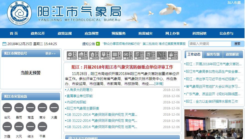 阳江市气象局主要职责:1、负责本行政区域内气象事业发展规划、计划的制定及气象业务建设的组织实施;负责本行政区域内气象设施建设项目的审查;对本行政区域内的气象活动进行指导、监督和行业管理。2、组织管理本行政区域内气象探测资料的汇总、传输;依法保护气象探测环境。3、负责本行政区域内的气象监测、预报管理工作,及时提出气象灾害防御措施,并对重大气象灾害作出评估,为本级人民政府组织防御气象灾害提供决策依据;管理本行政区域内公众气象预报、灾害性天气警报、预警信号以及农业气象预报、城市环境气象预报、火险气象等级预报等专业气象预报的发布。4、管理本行政区域人工影响天气工作,指导和组织人工影响天气作业;组织管理雷电灾害防御工作,贯彻执行《广东省防御雷电灾害管理规定》,负责本行政区域内防雷设施的设计审核、施工监督、竣工验收和定期检测、雷电灾害调查及事故鉴定等工作。5、负责向本级人民政府和同级有关部门提出利用、保护气候资源和推广应用气候资源区划等成果的建议;组织对气候资源开发利用项目进行气候可行性论证。6、组织开展气象法制宣传教育,负责监督有关气象法规的实施,对违反《中华人民共和国气象法》有关规定的行为依法进行处罚,承担有关行政复议和行政诉讼。7、统一领导和管理本行政区域内气象部门的计划财务、人事劳动、科研和培训以及业务建设等工作;会同县(市)人民政府对县(市)气象机构实施以部门为主的双重管理;协助地方党委和人民政府做好当地气象部门的精神文明建设和思想政治工作。8、承担上级气象主管机构和本级人民政府交办的其它事项。