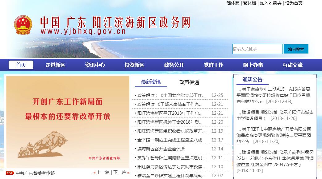 | 网站简介: 阳江滨海新区位于阳江市南海沿海,东邻珠三角地区,西靠环北部湾经济圈,南临南海海域,北枕阳江广袤大后方区域,是广东沿海重要产业基地和全国著名的滨海旅游胜地。新区规划总面积505.9平方公里,范围涉及5个街道、4个建制镇,包括江城区城南街道、岗列街道、城西街道、中州街道、白沙街道、埠场镇,高新区平冈镇,海陵岛闸坡镇以及阳西县溪头镇的部分区域。核心区包括城南新区片区、金朗岛片区、长洲岛南部片区三个商务服务组团,总面积55.22平方公里。起步区面积10.12平方公里,其中商务起步区位于城南新城,面积为7.02平方公里;临港产业起步区位于阳江高新区港口工业园,面积为3.1平方公里。阳江滨海新区的总体定位是努力建设成为中国滨海文化旅游度假目的地、广东沿海临港工业重要基地、粤西对接珠三角首要门户、江海交汇生态宜居新城。 |