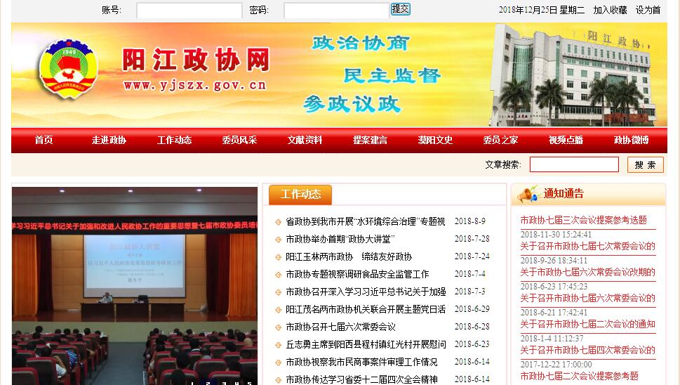 中国人民政治协商会议阳江市委员会(简称阳江市政协)成立于1989年4月。从1989年4月至今,历经第一届(1989.4-1994.3)、第二届(1994.3-1999.3)、第三届(1999.3-2004.4)、第四届(2004.4-2007.1)、第五届(2007.1-2012.1)、第六届(2012.1—2017.1)、第七届(2017.1— )。20多年来,在中共阳江市委的领导和广东省政协的指导下,阳江市政协围绕中心、服务大局,积极履行政治协商、民主监督和参政议政职能,为巩固和发展爱国统一战线,维护社会团结稳定,推动我市经济社会发展作出了重要贡献。为我市物质文明、政治文明、精神文明全面建设,为我市实现加快发展、率先发展、全面协调可持续发展发挥了积极的作用。政协履职方式逐步向制度化、规范化、程序化发展。中国人民政治协商会议阳江市委员会历届主席分别是:郑秉业(第一届),黎震球(第二届)、周裕光(第三、四届)、韦丽坤(第五、六届)、关则双(第六届)、丘志勇(第七届)。阳江市政协现由各党派、无党派人士、人民团体、各族各界代表、港澳同胞和侨胞侨属的代表以及特别邀请人士等共27个界别组成,其中:党派7个(中国共产党、中国民主同盟、中国民主建国会、中国民主促进会、中国农工民主党、中国致公党、九三学社)、无党派代表人士、人民团体6个(总工会、共青团、妇女联合会、工商联、台联会、侨联会)、界别11个(文化体育界、科学技术界、社会科学界、经济界、农业界、教育界、新闻界、医药卫生界、宗教界、少数民族界、社会福利界)和特邀人士(来自市委、市政府及市直机关部委办局、人民解放军、各县(市、区)及其他有代表性的特邀人士和特邀港澳人士)。阳江市政协现设有办公室和六个专门委员会。办公室下设6个科室(含专门委员会工作科)。其主要职责是:负责阳江市政协全体会议、常委会议、主席会议、常务委员专题座谈会、秘书长会议以及其他重要会议、活动的组织和服务工作。负责全体会议、常委会议、主席会议决议和决定的具体组织实施工作。负责协调、保障专门委员会实施专题调研计划和开展相关活动的组织服务工作。整理、报送政协组织和委员履行职能形成的调研报告、视察报告、大会发言、建议案;收集反映社情民意,处理委员和人民群众的来信来访,参与委员的协商推荐、届中增补等有关人事工作,负责委员培训、机关外事、机构编制、后勤保障等工作。阳江市政协设立六个专门委员会,即提案委员会、经济委员会、科教卫和环境保护委员会、文化和文史资料委员会、社会法制和民族宗教委员会、港澳台侨和外事委员会。专门委员会主要负责组织落实全体会议、常委会议、主席会议提出的各项任务,组织委员参加各项经常性活动,包括专题调研、视察、考察、座谈及提出提案等。阳江市政协开展工作主要方式:(一)会议。会议是政协履行职能的主要形式。主要会议有:全体会议、常委会议、主席会议等。此外,还根据需要召开各种形式的协商座谈会、论证会、意见听取会等。1.全体会议。是政协最高层次的协商形式。全体会议每年召开一次,主要职权是:选举主席、副主席、秘书长和常务委员;听取和审议常务委员会的工作报告、提案委员会的提案工作情况报告;参与对国家和地方事务重要问题的讨论,提出建议和批评;讨论并通过有关的决议等。2.常委会议。是全体会议闭会期间的主要协商形式。常委会议由主席、副主席、秘书长、常务委员组成,一般每季度召开一次。主要任务有:讨论地方重要事务和有关群众生产生活的重大问题;审议重要的建议案、提案和调研报告;研究政协工作中的重要事务等。3.主席会议。是常委会议闭会期间的重要协商形式。主席会议由主席、副主席、秘书长组成,每月召开一次。其主要任务有:讨论协商本会一些重要事务,包括重大决策、重要人物安排和群众普遍关心的重要问题;审查以阳江市委员会或常务委员会名义向中共阳江市委、市政府提出的重要建议案;拟定常委会议的日程和议程草案;审议提交常委会议的文件;执行常委会的决议,处理常委会的重要日常工作等。(二)提案。提案是政协委员、参加政协的党派团体和政协专门委员会向政协全体会议或常务委员会提出的、经审查立案后由承办单位办理的书面意见和建议。提案的提出一般有四种形式:一是政协委员可以个人或者联名方式提出提案。二是政协全体委员会议期间可以界别小组或者联组名义提出提案。三是参加政协的各党派和人民团体,可以本党派、团体名义或者联名方式提出提案。四是政协各专门委员会可以本专门委员会名义或者联名方式提出提案。对政协提案,承办单位按照有关规定认真办理后,在一定时限内给予书面答复,市政协采取多种方式督办。(三)视察。视察是政协委员履行职能的一项基础性工作,是委员了解情况、检查工作、研究问题、议政建言的重要途径,是委员行使民主权利、开展民主监督的重要渠道。阳江市政协每年都围绕党委和政府的中心工作,有计划地组织政协委员开展视察活动。(四)专题调研。开展专题调研、建言立论,是政协发挥优势参与国是的重要途径。专题调研一般以专委会为依托,以课题为纽带,联合、组织各行各业的专家学者,围绕中心工作,有重点地进行调查研究,提出切实中肯的意见和建议,推动我市政治建设、经济建设、文化建设的协