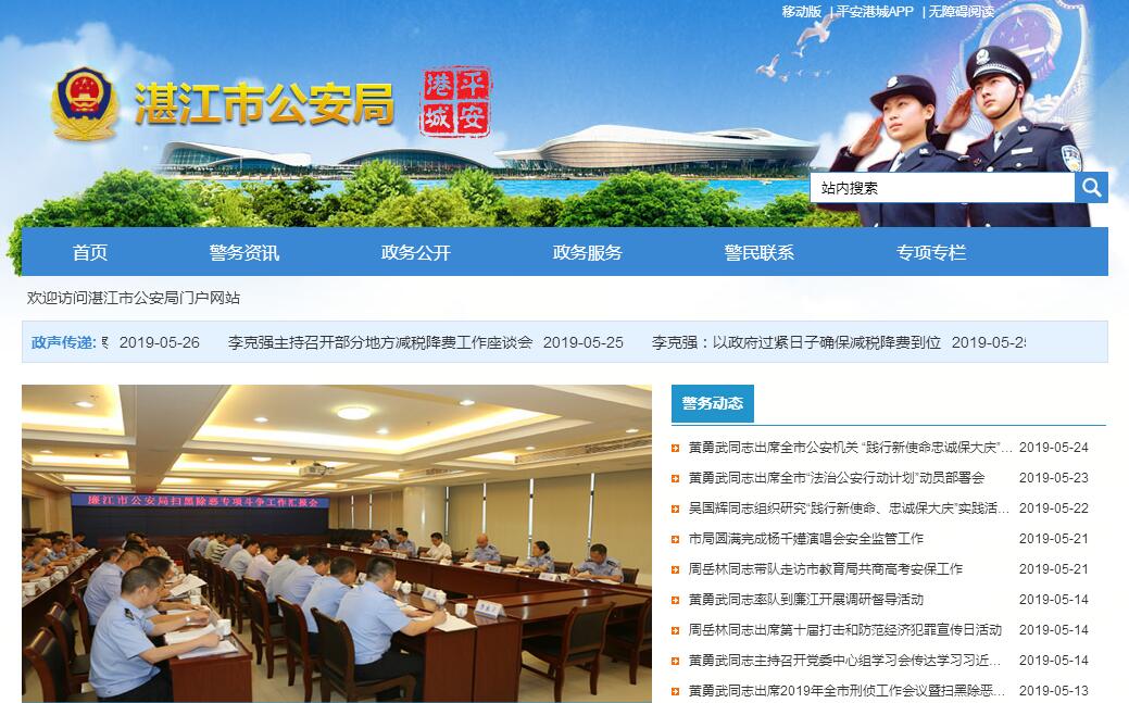 | 网站简介: 湛江市公安局是市政府主管全市公安工作的职能部门,受市政府、省公安厅双重领导。各县(市)区设有公安局(分局),在镇、乡、街道设派出所。其主要职责:一、预防、制止和侦查违法犯罪活动;二、维护社会治安秩序,制止危害社会治安秩序的行为;三、维护交通安全和交通秩序,处理交通事故;四、组织、实施消防工作,实行消防监督;五、管理枪支弹药、管制刀具和易燃易爆、剧毒、放射性等危险物品;六、对法律、法规规定的特种行业进行管理;七、警卫国家规定的特定人员,守卫重要的场所和设施;八、管理户政、国籍、入境出境事务和外国人在市内居留、旅行的有关事务;九、维护国(边)境地区的治安秩序;十、对被判处管制、拘役、剥夺政治权利的罪犯和监外执行的罪犯执行刑罚,对被宣告缓刑、假释的罪犯实行监督、考察;十一、监督管理计算机信息系统的安全保护工作;十二、指导和监督国家机关、社会团体、企业事业组织和重点建设工程的治安保卫工作,指导治安保卫委员会等群众性组织的治安防范工作;十三、法律、法规规定的其他职责。 |