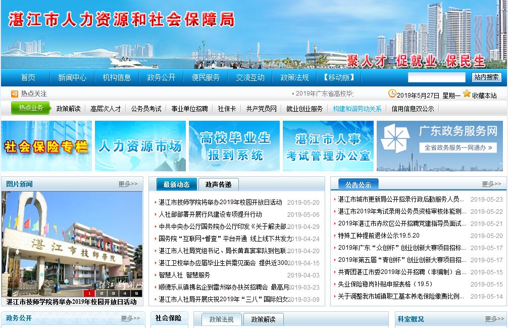 湛江人力资源和社会保障局主要职责:(一)贯彻执行国家和省有关人力资源和社会保障事业发展的方针政策和法律法规,拟订本市人力资源和社会保障事业发展规划、政策,并组织实施和监督检查。(二)拟订并组织实施本市人力资源市场发展规划和人力资源流动政策,建立统一规范的人力资源市场,促进人力资源合理流动、有效配置。(三)负责促进就业工作,拟订统筹城乡的就业发展规划和政策,完善公共就业服务体系,健全就业援助制度,完善职业资格制度,统筹建立面向城乡劳动者的职业培训制度,负责技工学校管理,牵头拟订高校毕业生就业政策,会同有关部门拟订高技能人才、农村实用人才培养和激励政策。(四)统筹建立覆盖城乡的社会保险体系。统筹拟订城乡社会保险及其补充保险的配套政策,组织实施统一的社会保险关系转续办法和基础养老金统筹办法,组织实施机关、企事业单位基本养老保险政策,会同有关部门拟订社会保险及其补充保险基金管理和监督制度,会同有关部门编制本市社会保险基金预决算草案。(五)负责就业、失业、社会保险基金预测预警和信息引导,拟订应对预案,实施预防、调节和控制,保持就业形势稳定和社会保险基金正常运行。(六)会同有关部门拟订机关、事业单位人员工资收入分配政策,建立机关企事业单位人员工资正常增长和支付保障机制,拟订机关企事业单位人员福利和离退休政策。(七)会同有关部门指导事业单位人事制度改革及拟定事业单位人员和机关工勤人员管理政策,指导人才管理和开发工作,制定专业技术人员管理和继续教育政策,负责企事业单位管理人员继续教育管理工作,牵头推进深化职称制度改革工作,负责高层次专业技术人才选拔和培养工作。(八)组织实施军队转业干部安置政策,负责军队转业干部安置计划的编制下达工作,负责军队转业干部的安置和教育培训工作,组织拟订部分企业军队转业干部解困和稳定政策,负责自主择业军队转业干部管理服务工作。(九)负责行政机关公务员和参照公务员法管理单位工作人员综合管理,组织实施公务员法工作,拟订有关人员调配政策和特殊人员安置政策,会同有关部门拟订市荣誉制度和政府奖励制度。(十)会同有关部门拟订农民工工作综合性政策和规划,推动农民工相关政策的落实,协调解决重点难点问题,维护农民工合法权益。(十一)组织实施劳动、人事争议调解仲裁制度和劳动关系政策,完善劳动关系协调机制,组织实施禁止非法使用童工政策和女工、未成年工的特殊劳动保护政策,组织实施劳动监察,协调劳动者维权工作,依法查处重大案件。(十二)承办市人民政府及省人力资源和社会保障厅、省公务员办公室交办的其他事项。