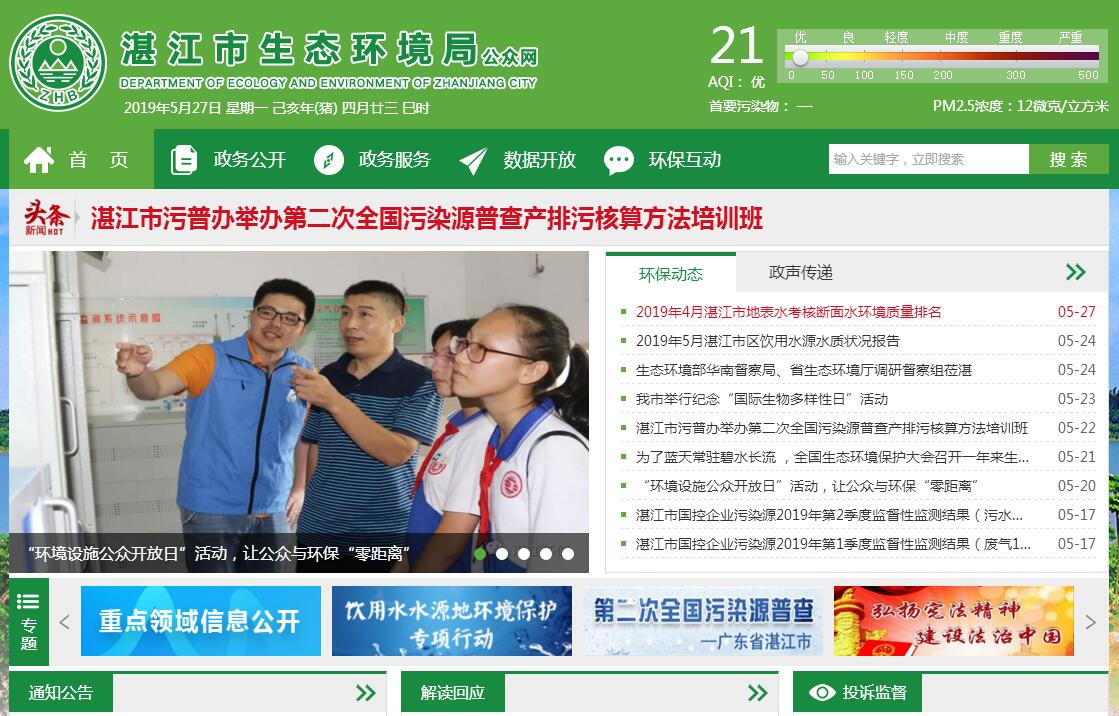 湛江市生态环境局是湛江市人民政府环境保护行政主管部门。其主要职责是:(一)贯彻执行国家和省有关环境保护的方针政策、法律法规和规章,拟订并监督实施本市环境保护规范性文件,组织编制环境功能区划,拟订全市环境保护规划,组织拟订并监督实施区域、流域污染防治规划和饮用水水源地环境保护规划,会同有关部门拟订海域污染防治规划,参与拟订市主体功能区划。(二)负责环境问题的统筹协调和监督管理。牵头协调环境污染事故、生态破坏事件的调查处理和区域、流域、海域环境污染防治工作,指导协调全市突发环境事件的应急、预警工作,协调解决跨区域环境污染纠纷,指导、协调和监督海洋环境保护工作,对近岸海域环境功能区的环境保护工作实施统一监督管理。(三)承担落实全市污染减排目标的责任。组织制定主要污染物排放总量控制制度并监督实施,提出实施总量控制的指标,督查、督办、核查各地污染物减排任务的完成情况,牵头实施环境保护目标责任制、总量减排考核并公布考核结果。(四)负责辖区排污费征收,指导并监督管理各县(市、区)排污费的征收,会同有关部门管理市级环境保护资金。(五)承担从源头上预防、控制环境污染和环境破坏的责任,加强规划环境影响评价。受市人民政府委托对重大经济和技术政策、发展规划以及重大经济开发计划进行环境影响评价,对涉及环境保护的规范性文件提出有关环境影响方面的建议,按管理权限审批开发区域、建设项目环境影响评价文件,负责建设项目竣工环境保护验收。(六)负责环境污染防治的监督管理。制定水体、大气、土壤、噪声、光、恶臭、固体废物、化学品、机动车等的污染防治管理制度并组织实施,会同有关部门监督管理饮用水水源地环境保护工作,组织指导城镇和农村的环境综合整治工作,牵头组织强制性清洁生产审核工作,负责环境监察和环境保护行政稽查以及环境信访工作,组织实施排污申报登记、排污许可证、重点污染源环境保护信用管理等各项环境管理制度。(七)指导、协调、监督生态保护工作。拟订生态保护规划,组织评估生态环境质量状况,监督对生态环境有影响的自然资源开发利用活动、生态环境建设和生态破坏恢复工作,指导、协调、监督各种类型的自然保护区、风景名胜区、森林公园的环境保护工作,协调和监督野生动植物保护、湿地环境保护工作,负责全市自然保护区的综合管理,指导、协调全市农村生态环境保护和生态示范区建设,监督生物技术环境安全,牵头组织生物物种(含遗传资源)资源保护工作,组织协调生物多样性保护。(八)负责民用核与辐射环境安全的监督管理。协助省监督管理核设施安全,参与民用核事故应急处理,负责辐射环境事故应急处理,监督管理民用核设施、核技术应用、电磁辐射、伴有放射性矿产资源开发利用中的污染防治,参与反生化、反核和辐射恐怖袭击工作。(九)负责环境监测和发布环境状况公报、环境信息。组织对全市环境质量监测和污染源监督性监测,组织对环境质量状况进行调查评估、预测预警,组织建设、管理本市环境监测网和环境信息网。(十)开展环境保护科技工作。组织环境保护科学研究和技术工程示范,指导和推动环境保护产业发展。(十一)组织环境保护的对外交流与合作,协调本市有关环境保护对外合作项目。(十二)组织、指导和协调环境保护宣传教育工作。制定并组织实施环境保护宣传教育纲要,开展生态文明建设和环境友好型社会建设的有关宣传教育工作,推动社会公众和社会组织参与环境保护。(十三)承办市人民政府和省环境保护厅交办的其他事项。