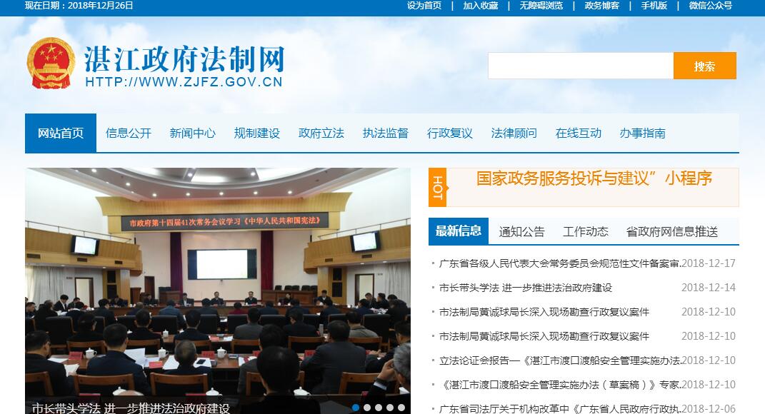 湛江市法制局的主要职责:(一)贯彻执行国家有关法制工作的方针政策,督促指导全市依法行政工作,调查研究依法行政工作中出现的新情况、新问题,提出推进依法行政的措施和建议。(二)拟订年度政府规范性文件制订计划,经批准后组织实施;起草或组织起草、审核、修改政府规范性文件草案以及应由本市负责起草的规范性文件。(三)承担行政执法监督的责任。建立、完善和组织实施行政执法监督制度;承担市人民政府行政执法督察办公室的日常工作,负责办理行政执法监督中的具体工作;审核依法应由市人民政府直接实施或者决定实施的行政处罚;协调部门之间在实施有关法律、法规、规章过程中产生的矛盾和争议;依法审核本市各级行政执法机关的行政执法职权和依据,对需要设立的行政执法队伍进行审核并按规定上报审批;承担市《行政执法证》的审核、下发和监督管理工作。(四)承担统筹规划政府立法工作;组织编制并实施政府立法规划、年度立法计划和立法后评估计划,起草或组织起草、修改、审核地方性法规草案和地方政府规章草案;负责规章的备案、解释工作;组织清理、编纂政府规章,翻译、审定政府规章外文版本。(五)负责市人民政府规范性文件草案的法律审核,承担市人民政府部门规范性文件的合法性审查和县(市、区)人民政府规范性文件的备案审查责任;办理公民、法人和其他组织对规范性文件提出的合法性审查申请事项,监督、指导全市规范性文件审查、审核及清理工作。(六)办理向市人民政府申请的行政复议、行政赔偿案件,审核市人民政府行政应诉事务,代理由法制局经办的市人民政府行政应诉事务,监督、指导和检查市人民政府所属工作部门和下级人民政府行政复议、行政应诉和行政赔偿工作。(七)负责市人民政府法律顾问事务。承办市人民政府重大决策、重要行政措施发布前的合法性审查及市领导同志交办的法律顾问事务,代理市人民政府民事诉讼事务。(八)指导行政机关规范性文件的清理、编纂工作,指导开展政府法制理论、政府法制工作研究和宣传及对外法制业务交流。(九)承办市人民政府和省人民政府法制办公室交办的其他事项。