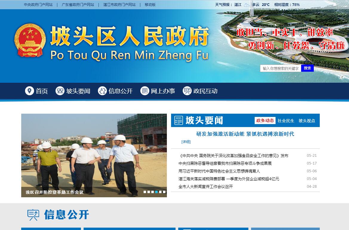 坡头区位于湛江海湾东岸,是城市东拓和“一湾两岸”发展战略的建设主体,下辖坡头、龙头、乾塘、官渡4个镇和南调、麻斜2个街道,总人口30.6万人,总面积422平方公里。中国海洋石油南海西部公司总部和海军南海舰队基地驻于区内。在坡头辖区内还规划了一座湛江新城——海东新区,列入广东省地级市城区扩容提质四个重点建设的新区之一。新区总规划面积约228平方公里,其中核心区范围49.8平方公里,起步区22.8平方公里。2013年,全区实现生产总值248.4亿元,增长6.5%;地方公共财政预算收入4.03亿元,增长33.8%,增速全市第一;固定资产投资56.4亿元,增长6.8%。坡头区拥有五大明显优势:一是地理环境得天独厚。坡头东、南、西三面环海,海岸线长达192公里,优良港湾众多,滩涂、港湾资源丰富自然环境条件优越,拥有红树林国家级自然保护区。自海东新区岸线和滩涂综合治理工程启动以来,清新的空气、优美的环境、绵长的岸线、独特的海滨,更是为建设生态、宜居、可持续发展的新城区提供了不可多得的条件。二是交通便捷,海、陆、空立体交通网络畅通无阻。坡头海岸距离湛江港不足3海里;区内有中国海洋直升机场,广湛高速公路、325国道贯穿全境;连接湛江海湾东、西海岸的湛江海湾大桥已于2006年底通车,坡头至湛江市区仅需10分钟车程,至规划中的湛江新机场仅需半小时车程。随着调顺跨海大桥、调顺跨海隧道、海东快线、沿海大道、麻乾观光大道、乾龙公路、汕湛高速连接线(湛江环城高速东环线)的全线贯通,海东新区小街小巷纵横交错,坡头将构筑起现代立体交通网络,打造便捷畅通的“一小时生活圈”。三是自然资源十分丰富。区内有大片可供开发利用的沙滩和可供养殖的浅海滩涂,鱼、虾、蚝、珍珠、贝类等养殖条件得天独厚;矿产资源蕴藏量大,已开采利用的矿产有优质玻璃沙、高岭土、钛、花岗岩等;土地资源潜力无限,海东新区2万亩土地,海湾大道、海东快线沿途数万亩土地以及各镇(街)储备的5000多亩土地,成为了坡头后发崛起最大的资本。四是具有旺盛的产业优势、配套的政策优势。坡头区认真贯彻落实省、市关于发展民营经济的政策措施,制定系列优惠政策,落实专人负责制度,提供全程优质服务,大力营造民营经济全面发展的良好氛围。建立企业信用担保市场运作机制,鼓励银企合作,切实帮助企业破解资金瓶颈问题。全区形成了以家电、建材、农海产品加工为骨干的优势产业。五是新城区充满魅力。2013年初,广东省委、省政府正式将海东新区开发建设写入省政府工作报告,列入地级市城区扩容提质四个重点建设的新区之一。省委、省政府将海东新区定位为“国际合作的重要门户、实施海洋战略的重大平台、大西南出海主通道基地、南亚热带生态型海湾城市、粤西中心城市的新兴载体”。目前,海东新区的基础设施、重点项目正加快建设。目前,新区发展总规获省政府批准,起步区控规获市政府批准,基础设施规划、产业发展规划完成初审上报,生态环境保护规划和城市设计正在开展。起步区涵盖了湛江奥林匹克体育中心、广东医学院附属医院海东分院、南粤湛江高级中学、珠影动漫文化产业中心等大型公共设施项目,都市型产业集聚区的金融中心、总部经济中心、湛江(义乌)小商品国际商贸城等商业服务业设施项目,以及科技产业园以深圳华思科技、湛江恒光电器等为代表的电子电器工业项目。到2030年,海东新区将建设成为集政务、商务、金融、高新科技、物流、旅游、科教、文体、休闲、居住功能为一体的生态型海湾新城。当前,坡头迎来了跨越发展的良机,区委、区政府抢抓机遇,发挥优势,坚持“工业立区、商业旺区、生态建区、科教兴区、和谐安区”发展战略,按照“围绕一个目标、注重两个结合、抓住三个主题、打造四个板块、强化五个举措”的“一二三四五”发展思路,以做大做优经济“蛋糕”为抓手,致力打造湛江市最亮丽的城市新名片。预计到2017年,坡头将初步建成生态型滨海新城。海东新区有明显变化。集高新技术产业、文化创意产业、休闲娱乐产业之大成,海东新区(含南调)可容纳20万人居住,商业零售额增加到100亿元以上,二十多条通衢大道构筑起四通八达立体交通网络,气势恢宏的湛江奥林匹克中心傲立海边,多幢超五星级铂金豪华酒店高耸入云,富丽堂皇的高级写字楼魅力四射,世界名牌的广告霓虹流光溢彩,国内国际大公司总部的金漆招牌熠熠生辉,总部经济日益繁荣。创意科技园、国际会议中心、文化交流中心等城区文化教育卫生设施配套齐全,形成商业中心雏形。科技产业园有明显发展。科技产业园工业总产值增长到100亿元以上,着力推进省级产业转移园申报工作,逐步形成“一园两区”的发展格局。官渡园区规划面积扩大到5000亩,投产企业由现在43家增加到150家。龙头园区设计承载项目超过200个,年产值200亿元,年税收8亿元。园区实施“拆烟囱引五新”行动,将整合49家实心粘土砖厂4300亩连片土地,“腾笼换鸟”引进“五特五新”产业。深圳华思科技等一大批国内外知名企业落户园区。商业发展有明显跨越。海湾大道、海东大道“沿路经济”不断发展,汽车商贸、物流配送、建材物资、专业批发成行成市;经“穿衣戴帽”改造的南调路两旁建筑物整齐划一、别具风格,街道两旁商铺林立,供销两