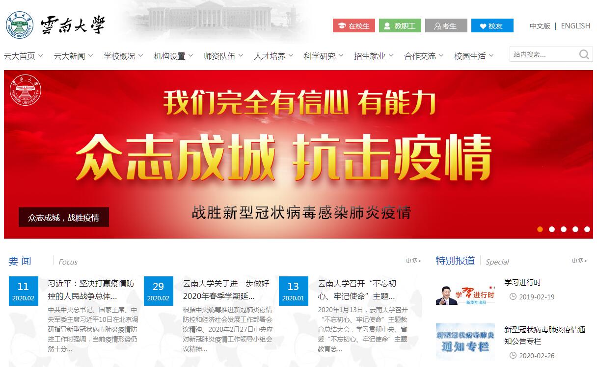 云南大学始建于1922年,时为私立东陆大学,1934年更名为省立云南大学,1938年改为国立云南大学,是我国西部边疆最早建立的综合性大学之一。1937年,著名数学家、教育家熊庆来出任校长,一大批著名学者受聘到校任教,奠定了学校较高的发展基点和深厚的学术底蕴,开创了云大办学历史上的第一个辉煌时期。20世纪40年代,云南大学已发展成为一所包括文、法、理、工、农、医等学科在内,规模较大,在国际上有影响的中国著名大学之一。1946年,《不列颠百科全书》将云南大学列为中国15所在世界最具影响的大学之一。五十年代院系调整,部属云南大学一些重要而有特色的系科,如航空、土木、法律、铁道等被划出并入当时的北京航空学院、四川大学、西南政法学院、长沙铁道学院等高校;工、医、农等先后独立建校,并逐步发展为今天的昆明理工大学、昆明医科大学、云南农业大学、西南林业大学等高校。1958年,云南大学由中央高教部划归云南省管理。1978年,云南大学被国务院确定为全国88所重点大学之一。改革开放后,云南大学获得了长足的进步。1996年首批列入国家“211工程”重点建设大学,2001年列入西部大开发重点建设院校,2004年成为教育部和云南省人民政府重点共建高校,2006年本科教学工作水平评估共19项二级指标全部评定为A,被教育部评为本科教学优秀学校,2012年成为国家“中西部高校基础能力建设工程”和“中西部高校提升综合实力工程”实施院校,2016年成为国家“一省一校”工程实施院校,2017年成为中国首批42所“一流大学”建设高校之一,2018年跻身于中西部14所“以部为主、部省合建”高校行列。新的历史时期,云南大学将紧紧围绕建设世界一流大学目标,主动融入国家战略,积极服务云南经济社会发展,遵循“开放合作、集成创新、协调共进、特色发展”的发展理念,按照立足云南、服务国家、辐射两亚、走向世界的办学思路,以“一流党建”为引领,以内涵建设为重点,以体制机制改革为动力,大力实施“学术兴校”战略和“人才强校”战略,着力推进“树木树人计划”“云南大学服务云南行动计划”,全面提升学校办学实力和办学水平,为区域经济社会发展做出贡献。云南大学下设27个学院、14个研究机构、1个公共课教学部及2个独立学院,1个附属医院,设有研究生院。学校现有教职员工2965人,其中专业技术岗位2460人,具有正高职称的445人,具有副高职称的861人,具有博士学位1127人。学校有全日制在校本科学生16730人,硕士研究生10907人,博士研究生1024人。学校占地面积4363.64亩,分布于呈贡校区和东陆校区,公用校舍建筑面积100余万平方米;教学、科研仪器设备及信息化设备资产总值8.12亿余元,图书馆藏书360余万册。学校是中国教育科研计算机网络(CERNET)云南主节点单位。云南大学有本科专业86个,国家特色专业12个,拥有民族学、生态学、专门史、微生物学4个国家级重点学科,52个省级重点学科;有21个一级学科博士学位授权,42个一级学科硕士学位授权,22个专业硕士学位授权。在教育部第四轮学科评估中,我校有30个学科进入全国前70%,其中,A类学科2个(民族学为A+,生态学为A-),B类学科14个。微生物学、化学、植物学与动物学学科进入全球ESI前1%。学校形成了以民族学、生物学、特色资源开发与环境保护,以及边疆问题和东南亚、南亚国际问题研究为优势特色,学科较为齐全,人才密集的综合性大学。学校大力实施人才强校战略,高层次人才快速增加。现有院士7人(含双聘、特聘、外籍),国家“千人计划”创新项目入选者3人、青年项目入选者3人、高层次外国专家项目入选者1人,教育部“长江学者”特聘教授5人、讲座教授2人,国家自然科学基金杰出青年科学基金获得者8人,国家自然科学基金优秀青年科学基金获得者2人,国家“万人计划”领军人才4人、青年拔尖人才支持计划入选者2人、教学名师3人,“973”项目首席科学家4人,人社部“百千万人才工程”入选者8人,中宣部文化名家暨“四个一批”人才工程入选者1人,全国模范教师2人,教育部“新世纪优秀人才培养计划”、“跨世纪优秀人才培养计划”和“高等学校骨干教师资助计划”入选者15人,教育部“高校优秀青年教师奖”获得者1人,国务院学位委员学科评议组成员3人,“云南省科技领军人才”6人,“云岭学者”19人,“云岭教学名师”5人,“第十届中国青年女科学家奖”获得者1人,云南省高端科技人才引进计划入选者13人,云南省引进海外高层次人才计划入选者14人,云南省中青年学术技术带头人、技术创新人才120人,云南省中青年学术技术带头人后备人才37人,云南省高校教学科研带头人17人,国家级教学名师4人,云南省教学名师25人,云南省高等学校名师工作室20个,国家级教学团队4个,云南省级教学团队11个,教育部创新团队1个,省级创新团队14个,云南省高等学校科技创新团队6个,云南省哲学社会科学创新团队21个。学校以学术兴校为核心,科学研究、平台建设成果斐然。学校先后主持国家“973计划”项目2项、“863计划”项目4项、国家水专项重大项目2项,国家重点研发计划1项,国家科技支撑计划2项,国家社会科学基金重大招标项目13项,教育部人文社会科学重大攻关项目4项,马克思主义理论研究和建设工程项目2项,国家社科基金成果文库4项,“新工科”研究与实践项目2项。荣获国家自然科学一等