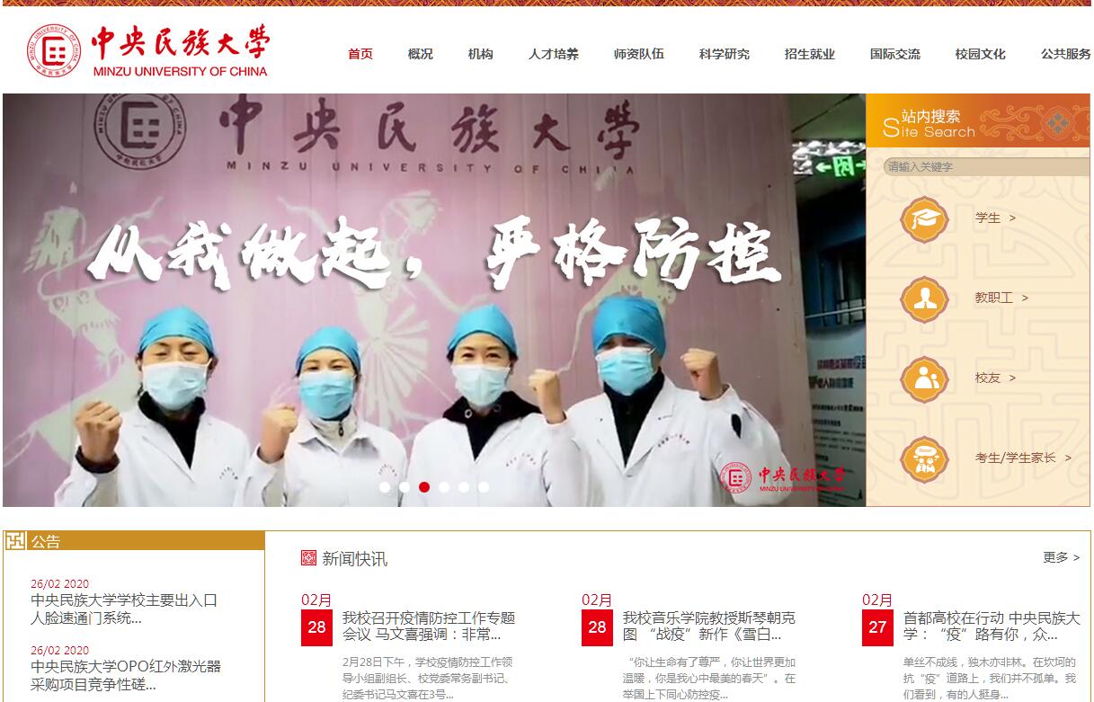 中央民族大学(Minzu University of China)坐落于北京学府林立的海淀区,南邻国家图书馆,北依中关村科技园,校园环境典雅,古朴幽美,人文氛围浓郁,具有鲜明的民族特色。中央民族大学的前身是1941年9月中国共产党在延安创办的民族学院。1951年6月,中央民族学院在北京正式成立,乌兰夫任首任院长。1993年11月,更名为中央民族大学。现任校党委书记张京泽、校长黄泰岩。党和国家历届领导集体始终关心和重视中央民族大学的建设和发展。建校初至1966年,毛泽东、刘少奇、周恩来、朱德等党和国家领导人先后14次接见学校师生代表。改革开放以后,邓小平3次接见师生代表。1993年学校更名为中央民族大学时,国家主席江泽民同志为学校题写了新校名。2001年6月,学校50周年校庆之际,国务院总理朱镕基同志到校视察,并代表中央政府提出了“把中央民族大学建成世界一流的民族大学”的奋斗目标。同年,胡锦涛、李岚清等国家领导人亲自审批了国家民委、教育部、国家计委、财政部四部委联合上报的《关于进一步办好中央民族大学的请示》。2002年6月,国家民委、教育部、北京市人民政府签署了《关于重点共建中央民族大学的协议》。在党和国家的高度重视下,学校1978年被批准为国家重点大学,在其后发展中,先后进入“211工程”、“985工程”和“一流大学、一流学科”国家重点建设大学行列。学校建校之初,一批学界名流,如潘光旦、吴文藻、费孝通、翁独健、吴泽霖、冯家昇、杨成志、林耀华、傅乐焕、于道泉、闻宥、马学良、王锺翰等到校任教,成为学校教学科研和学科建设的重要奠基人。现有教职工总数为1893人,其中专任教师1196人,专任教师中教授、副教授678人,占专任教师总数的57%。他们当中有戴庆厦、牟钟鉴、胡振华、施正一、刘秉江、马跃、靡若如、李魁正、杨圣敏、金炳镐、薛达元等知名专家学者,还有不断涌现的诸多中青年新秀,已渐成学界翘楚。另外,学校每年都聘有130多名外籍专家任教。学校目前有教育部“长江学者奖励计划”特聘教授3人、教育部“长江学者奖励计划”青年学者1人、中组部“千人计划”特聘教授1人、“国家百千万人才工程”人选12人、教育部“新世纪优秀人才支持计划”人选56人,国家民委突出贡献专家11人。国家级教学名师2人,北京市教学名师16人,享受国务院政府特殊津贴113人。学校与35个国家和地区的150余所大学和科研机构建立了交流合作关系,每年都有一批在相关学科领域有重要影响的著名学者来校访问讲学、交流。学校现有24个学院,有覆盖10个学科门类的64个本科专业、5个一级学科博士学位授权点、5个博士后科研流动站,26个一级学科硕士学位授权点,国家级重点学科3个、省部级重点学科一级5个、二级13个,省部交叉重点学科1个,2个国家文科基础学科人才培养和科学研究基地, 1个教育部人文社会科学重点研究基地,6个国家民委人文社会科学重点研究基地,1个国家民委-教育部共建重点实验室,1个教育部民族教育发展中心重点研究基地,1个北京市重点工程中心,1个国家级实验教学示范中心,5个北京市实验教学示范中心。学校面向全国31个省、自治区、直辖市和台港澳地区招生,现有全日制在校生16858人,其中本科生11283人,硕士、博士研究生4708人,少数民族预科生184人(本校);本科生(含预科生)中,少数民族学生比例为50%。学校是“中国政府奖学金”留学生接收学校,有来自50多个国家的近700名留学生在校学习。建校以来,学校为国家输送了10万余名各民族毕业生。其中有知名专家学者近千名,少数民族省部级领导干部近百名,地厅级领导干部近千名,县处级领导干部万余名,他们在不同的岗位上为国家的民族团结与发展事业做出了突出的贡献。中央民族大学已成为培养少数民族杰出人才和民族团结表率的摇篮。学校现占地面积为38万平方米,另规划新校区占地面积81万平方米。校园建筑面积59.2万平方米,教学行政用房20余万平方米,资产总值34亿元。拥有各类图书和电子图书430万余册,民族学、中国少数民族语言文学图书文献资料藏量居国内高校前列。学校出版社是全国民族学科教材和著作的出版基地,《中央民族大学学报》和《民族教育研究》是面向国内外发行的全国核心期刊。民族博物馆藏有3万余件珍贵的民族文物,已经成为学生爱国主义教育和教学实践基地。目前,全校师生员工高举习近平新时代中国特色社会主义思想伟大旗帜,深入贯彻落实党的十九大精神,不忘初心,牢记使命,服务于国家战略和民族团结进步事业,服务于少数民族和民族地区发展,确定学校发展的“三步走”阶段性目标,实施质量立校、人才强校、特色兴校、管理强校和开放办校五大战略,以改革创新精神和攻坚克难的勇气,奋力推进特色鲜明的世界一流大学建设。