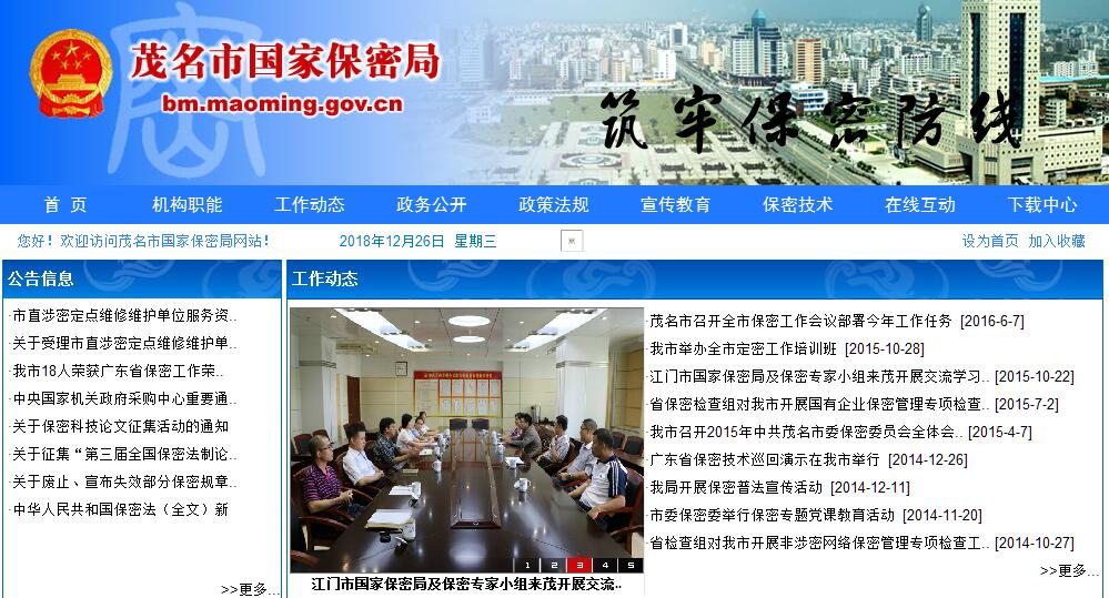 | 网站简介: 茂名市国家保密局根据《保密法》及有关保密规定,各级保密工作部门是同级政府主管保密工作的职能机构。它负有贯彻执行国家保密工作方针政策、监督保密法规实施、指导保密工作、开展保密宣传教育、组织保密检查、管理保密技术、依法查处泄密事件等七项职责。 各机关、单位的保密组织负责管理本机关、单位的保密工作。凡涉及国家秘密较多、业务范围较广的机关、单位应根据实际需要设立保密办事机构或配备专职职保密干部;其他机关、单位也应由专人或指定人员承担日常保密工作。目前,市保密局是两块牌子一套人马,既是市委保密委员会的办事机构,也是政府主管保密工作的职能机构。下设两个职能科室:综合科--负责保密宣传教育、日常管理等工作;保密技术检查中心――负责保密技术检查、监控,保密检测和防范等工作。 |