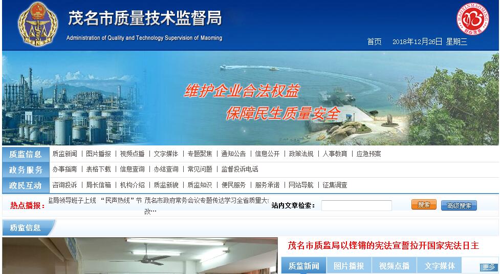 茂名市质量技术监督局主要职责:(一)贯彻执行国家和省有关质量技术监督工作的方针政策和法律法规,拟订并组织实施提高全市质量水平的发展战略及有关政策,起草有关地方性法规、规章草案。(二)负责产品质量宏观管理和诚信体系建设工作。组织实施国家质量发展纲要,推进质量强市和名牌发展战略;完善质量管理体系,营造公平规范的市场秩序,加强事中事后监管,完善标准和质监法规体系。(三)制定现代质量监管体系规划并组织实施。制订并组织实施质量技术监督科技发展和技术机构建设规划,组织科研项目申报工作。(四)依法监督管理认证认可工作。依法对产品质量检验检测机构进行资质认定和监督管理,依法监管认证机构,依法监督管理体系认证和产品认证工作。(五)负责监督管理标准化工作。组织地方标准制定工作,监督标准的贯彻执行,推行采用国际标准和国外先进标准,指导企事业单位的标准化工作,组织实施全市组织机构代码和商品条码工作,监督管理组织机构代码、商品条码和数据识别编码的应用工作。(六)负责统一管理计量工作。组织执行国家计量制度,推行法定计量单位,依法管理计量器具,组织量值传递、溯源和比对工作,推进工业、服务业计量现代化,规范和监督商品量和市场计量行为。(七)负责综合管理特种设备安全监察、监督、风险防范和伤害监测工作,组织高耗能特种设备节能监管工作,对特种设备进口实施监督检查,依法承担特种设备安全事故调查工作。(八)负责全市食品相关产品生产加工质量安全监督管理工作。组织实施生产许可、监督抽查、风险防范和伤害监测等工作,按规定权限组织调查食品相关产品生产加工涉及的质量安全事故。(九)负责产品质量安全监督工作。组织实施产品质量安全强制检验、监督抽查、风险防范和伤害监测工作,负责工业产品生产许可管理工作,监督管理产品质量安全仲裁检验工作。(十)会同有关部门组织实施重大工程设备质量监理制度,组织重大产品质量事故调查,实施缺陷产品召回制度,监督管理产品防伪工作;依法查处产品质量违法行为,按分工打击制售假冒伪劣商品违法行为;组织协调开展产品质量安全专项整治和有关专项打假工作,对重大案件进行督查督办。(十一)依法管理和指导全市质量技术监督业务工作,组织指导全市质监系统干部业务培训和素质教育相关工作,指导全市质监系统规范化建设和行政效能、政风行风建设,统筹全市质监系统信息化建设有关工作。(十二)承办市人民政府和上级质量技术监督部门交办的其他事项。