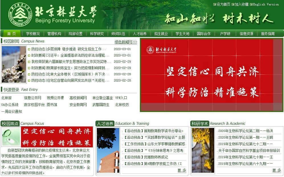 北京林业大学是教育部直属、教育部与国家林业局共建的全国重点大学。学校办学历史可追溯至1902年的京师大学堂农业科林学目。1952年全国高校院系调整,北京农业大学森林系与河北农学院森林系合并,成立北京林学院。1956年,北京农业大学造园系和清华大学建筑系部分并入学校。1960年被列为全国重点高等院校,1981年成为首批具有博士、硕士学位授予权的高校。1985年更名为北京林业大学。1996年被国家列为首批“211工程”重点建设的高校。2000年经教育部批准试办研究生院,2004年正式成立研究生院。2005年获得本科自主选拔录取资格。2008年,学校成为国家“优势学科创新平台”建设项目试点高校。2010年获教育部和国家林业局共建支持。2011年与其他10所行业特色高校参与组建北京高科大学联盟。2012年,牵头成立中国第一个林业协同创新中心——“林木资源高效培育与利用”协同创新中心。2016年,学校“林木分子设计育种高精尖创新中心”入选北京市第二批高精尖创新中心。2017年,学校入选世界一流学科建设高校行列,林学和风景园林学两个学科入围“双一流”建设学科名单。学校以生物学、生态学为基础,以林学、风景园林学、林业工程、农林经济管理为特色,是农、理、工、管、经、文、法、哲、教、艺等多门类协调发展的全国重点大学。学校是国务院学位委员会、教育部授权可自行审定教授任职资格的高校,是国务院学位委员会授权一级学科内可自主设置博士、硕士二级学科及交叉学科的高校。经全国第四轮学科评估,林学和风景园林学两个一流建设学科位居A+档位。学校现有15个学院,60个本科专业及方向、26个一级学科硕士学位授权点、1个二级学科硕士学位授权点、12个专业硕士学位类别、9个一级学科博士学位授权点、7个博士后流动站,1个一级学科国家重点学科(含7个二级学科国家重点学科)、2个二级学科国家重点学科、1个国家重点(培育)学科、6个国家林业局重点学科(一级)、3个国家林业局重点培育学科、3个北京市重点学科(一级)(含重点培育学科)、4个北京市重点学科(二级)、1个北京市重点交叉学科。学校形成了“知山知水,树木树人”的办学理念,为国家培养了10多万名高级专门人才和一批外国留学生,其中包括15名两院院士等为代表的一大批杰出科技专家和管理人才,他们为我国林业事业和经济社会发展做出了卓越贡献。截至2017年12月,学校在校生27657人,其中本科生13233人,全日制研究生5717人,在职攻读硕士学位908人,各类继续教育学生7799人。学校现有教职工1884人,其中专任教师1195人,包括正教授310人、副教授555人;中国工程院院士3人,中组部“千人计划”入选者3人,“万人计划”领军人才入选者3人,青年拔尖人才入选者1人,国家特聘专家1人,教育部“长江学者奖励计划”入选者7人,国家“973”首席科学家1人,“863”首席专家1人,国家社科基金重大项目首席科学家1人,国家百千万人才工程(新世纪百千万人才工程)入选者10人,中宣部文化名家暨“四个一批”人才入选者1人,科技部“中青年科技创新领军人才”入选者1人,环保部“国家环境保护专业技术青年拔尖人才”入选者1人,“国家杰出青年科学基金”获得者5人,“国家优秀青年科学基金”获得者5人,“中国青年科技奖”获得者8人,“中国青年女科学家奖”获得者1人,“科技北京”百名领军人才入选者1人,北京市优秀青年人才入选者1人,北京市高创人才支持计划青年拔尖人才入选者1人,北京高校青年英才计划入选者50人,北京市优秀人才支持计划入选者25人,国家有突出贡献专家8人,省部级有突出贡献专家23人,享受政府特殊津贴专家140人,教育部“创新团队发展计划”3支。教师获奖众多,其中有1人获全国创新争先奖,1人获何梁何利科技进步奖,1人获国际环境突出贡献奖,3人获全国优秀科技工作者称号,2人获全国模范教师称号,3人获全国优秀教师称号,1人获全国高校思想政治理论课优秀教师称号,1人获北京市人民教师奖。学校高度重视教学工作,实施导师制、主辅修制,拥有国家理科基地、国家卓越农林人才培养计划、梁希实验班、中外合作办学等多种拔尖创新人才和复合型人才的培养模式。学校获得国家级教学成果一等奖3项、二等奖6项、优秀奖1项和省部级教学成果奖42项。5篇博士学位论文入选“全国优秀博士论文”,5篇博士学位论文入选“北京市优秀博士论文”。研究生53人次在国际风景园林师联合会国际学生风景园林设计竞赛(IFLA-UNESCO)、国际大学生建筑设计大赛、中日韩大学生风景园林设计竞赛中获得金奖。近三年本科毕业生就业率始终在94%以上。学校科学研究和科技平台建设实力雄厚、成果丰硕。现有国家、省(部)级重点实验室、工程中心及野外站台共42个。其中,国家花卉工程技术研究中心1个、林木育种国家工程实验室1个、国家野外观测科学研究站1个、国家能源非粮生物质原料研发中心1个、林业生物质能源国际科技合作基地1个、国家水土保持科技示范园区2个、教育部重点实验室3个、教育部工程中心3个、国家林业局重点实验室7个、国家林业局工程技术研究中心3个、国家林业局质检中心1个、国家林业局野外观测研究站6个、北京实验室1个、北京市重点实验室8个、北京市工程技术研究中心3个。“十二五”以来,以第一作者单位发表论文被SCI收录3734篇,E