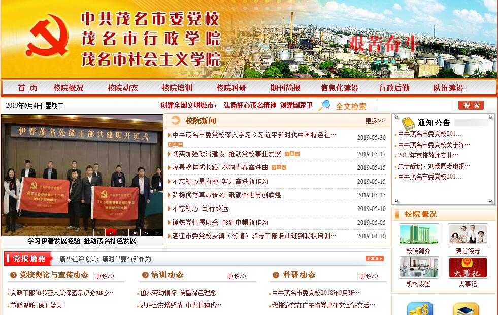 中共茂名市委党校创办于1959年5月,是在市委直接领导下培养党员领导干部和理论干部的学校,是市委的一个重要部门,现与茂名市行政学院、茂名市社会主义学院实行一个机构三块牌子,其主要任务是培训轮训县(市、区)党委常委和副县(市、区)长、全市(含各县、市、区)未参加省委党校培训的正、副处级和正、副科级以及市直机关其他党员干部;培训中青年党员领导干部、意识形态部门的领导干部和理论骨干;协助组织人事部门,对学员在校期间进行考核考察;承担政府委托的公务员培训任务;负责各民主党派、无党派人士领导干部的培训工作;承担部分成人教育任务,配合中央党校、省委党校办好在职研究生班的函授教育;围绕国内外,特别是茂名市的新情况、新问题,联系实际,开展科学理论研究,结合培训、教学要求,组织调查研究,做好校刊的编辑、出版、发行工作;对县(市、区)委党校教学业务统筹、指导。中共茂名市委党校实行校务委员会领导体制,校长由市委常委、组织部部长兼任,日常工作由常务副校长主持。学校设有办公室、教务一科、教务二科、继续教育科、行政科、政治教研室、经济教研室、行政学教研室、党建文史教研室、法学教研室、科研管理科和信息网络中心12个科级机构。现有教职工62人,其中正、副高级职称8人,中级职称10人,初级职称5人,硕士5人。2006年根据省委的部署,实施了市县党校办学体制改革,将茂南、茂港、信宜、高州、化州、电白六个县(市、区)委党校改为茂名市委党校的分校,分校的学制设置、教学内容、教学计划、师资调配和教学考评由市委党校统筹安排,从而基本形成了以市委党校为主体,各县(市、区)分校为依托的新办学格局。中共茂名市委党校位于茂名市的中心区,地处繁华路段,校园建筑总面积34273平方米,拥有教学楼、办公楼、综合楼、学员宿舍楼、招待所和三幢教职工宿舍楼, 15层新教学大楼即将投入使用,还有篮球场、室内乒乓球台等。拥有3个多媒体教室和现代化的电教设备,用于教学和办公的电脑100多台,建成了与中央党校、省委党校联网的远程教学C级网站,还初步建成了校园网络,添置各种自动化设备,进一步提高了教学和办公的信息化程度。图书室藏书3万多册,征订各种杂志(刊物)260多类、报纸50多种。已初步形成一个具有一定规模、教学设施比较齐全的党政干部培训轮训基地。中共茂名市委党校建校以来,紧紧配合党在各个历史时期的中心工作,充分发挥培训轮训干部主渠道、主阵地作用。“十一五”期间,共举办处级干部进修班、中青年干部培训班、公务员任职培训班、公务员初任培训班、普通党员轮训班等各种班次106期,培训轮训领导干部和理论骨干18937人次;各县(市、区)分校共举办培训班302期,培训轮训领导干部和理论骨干39865人次,各县(市、区)分校还积极“送训下乡”,为基层干部群众举行各种专题培训。此外,全市各级党校积极抓好学历教育,举办各类函授班,共培养本科毕业生2258人、专科毕业生2085人,招收在职研究生60人。市委党校教研人员在各级刊物上公开发表论文506篇,其中国家级8篇,省级154篇;有5个科研项目获全省党校系统、省社会主义学院系统、省委组织部和省党建学会等课题立项,出版了《茂名现代化战略研究》、《茂名市领导干部加快转变经济发展方式学习读本》等科研专著,教师研究成果先后获省委宣传部、省社科联、省委党校、泛北部湾党校合作论坛及茂名市等科研奖励共100多项。主办刊物《党政学刊》,出版质量不断提高,有一定的社会影响力。“十二五”时期是党校改革发展的关键时期和战略机遇期,我们一定坚持以马克思列宁主义、毛泽东思想、邓小平理论和“三个代表”重要思想为指导,全面贯彻落实科学发展观,围绕市委、市政府工作大局,按照实事求是、与时俱进、艰苦奋斗、执政为民的要求,以加强党的执政能力建设和先进性建设为重点,联系实际创新路,加强培训求实效,大规模培训干部,大幅度提高干部素质,不断改善办学条件,努力争创“粤西一流党校”,为茂名实现“三年大变化,十年大跨越”和建设文化强市提供坚强的思想政治保证、人才保证和智力支持。