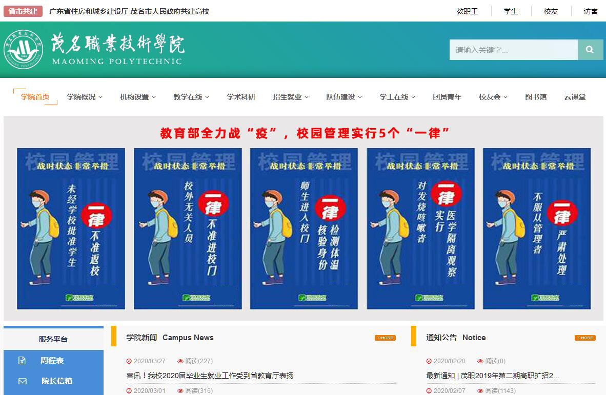 茂名职业技术学院是广东省住房和城乡建设厅、茂名市人民政府共建高校,2004年经广东省人民政府批准成立,是茂名市第一所全日制公办高等职业技术院校,学校前身是创建于1986年的国家重点中专学校茂名市建设中等专业学校。学校秉持“修德 强技 求实 创新”校训,确立“价值观+知识+技能+创新”四位一体人才培养目标,注重培养学生的职业能力、创新精神和创业能力,大力推进工学结合,校企合作,以培养生产、服务、管理第一线的高级技术技能人才为己任,先后为社会输送了4万余名毕业生。学校现有文明北、水东湾新城和人民南三个校区,现有校园面积1003.79亩,建筑面积215886.61平方米,其中教学行政用房面积106302.4平方米,学生宿舍面积83315平方米,体育场(馆)面积6.2万平方米,教科研仪器设备值约5500万元,图书馆馆藏纸质图书达到56万多册,中文期刊342种、外文期刊4种、报纸40种、电子图书33万余种、数据库8个。有省级实训基地6个,校内实训室127个,与企业合作共建的校外实训基地175个。建有工程测量、化学检验、数控车床、电工、电气设备安装等13个工种的国家职业资格鉴定考点,是全国职业核心能力示范培训试点单位。2016年6月,经中国建设教育协会审批,在学校设立粤西地区唯一一个全国BIM应用技能考点。学校现有全日制普通高职在校学生14000余人,专任教师560余人,教授、副教授及其他高级职称教师130余人,具有博士、硕士学位教师340余人,双师素质教师320余人,聘请国内外高等院校、科研院所及知名企业等专家学者担任客座教授50人,外聘兼职教师300余人。学校现设有土木工程系、化学工程系、机电信息系、经济管理系、计算机工程系、人文与传媒系、社科基础部、成人教育部、中专部(中专学校)等9个教学系(部),开设有建筑工程技术、建筑工程管理、道路桥梁工程技术、供热通风与空调工程技术、石油化工技术、应用化工技术、机械制造与自动化、电气自动化技术、会计电算化、电子商务、旅游管理、计算机应用技术、计算机通讯、社会工作等39个专业(共49个专业方向)。专业结构和布局与广东省和茂名市经济增长点的需求相匹配,形成了“以工学为主,文、理、经济、管理等多学科协调发展”的专业格局。学校紧密结合地方经济社会发展状况,紧密依托行业企业,开展多形式、多途径的校企合作,形成了“对接、合作、共赢”的良好局面,先后与深圳地铁、宝钢钢铁、蒂森克虏伯电梯有限公司、中石化、富士康C次集团、万豪国际等多家世界500强企业下属公司签订了校企合作联合培养协议,设立订单班、冠名班、现代学徒制试点班等78个,与企业合办混合所有制二级学院4个。学校重视学生创新精神和创业能力培养,近年来,学生400余人次在省级以上技能大赛中获奖,其中50余人次获得国家级、省级一等奖。毕业生深受用人单位欢迎,历届毕业生总体就业率均达97%以上,连续6年位居全省专科层次院校前列,据广东省教育厅发布的就业数据,2014年至2016年,我校毕业生初次就业率分别为97.45%、97.40%、97.36%,均高出全省专科高校2个百分点。据中国首家高等教育管理数据与咨询的专业公司麦可思研究院对毕业生的社会需求与培养质量进行的第三方数据调查及分析结果表明,2012年以来,我校毕业生整体就业率、毕业半年后收入、工作与专业相关度、职业吻合度、总体就业现状满意度等指标均高于本省高职院校平均值。 “十三五”期间,学校将牢牢把握国家大力发展职业教育的战略发展机遇,以“四个坚持、三个支撑、两个走在前列”为统领,紧紧围绕“一带一路”、创新驱动及产业转型升级,大力推进创新发展、内涵发展、特色发展,努力把学校建设成为以工科为主,特色鲜明,优势明显的粤东西北一流高职院校。