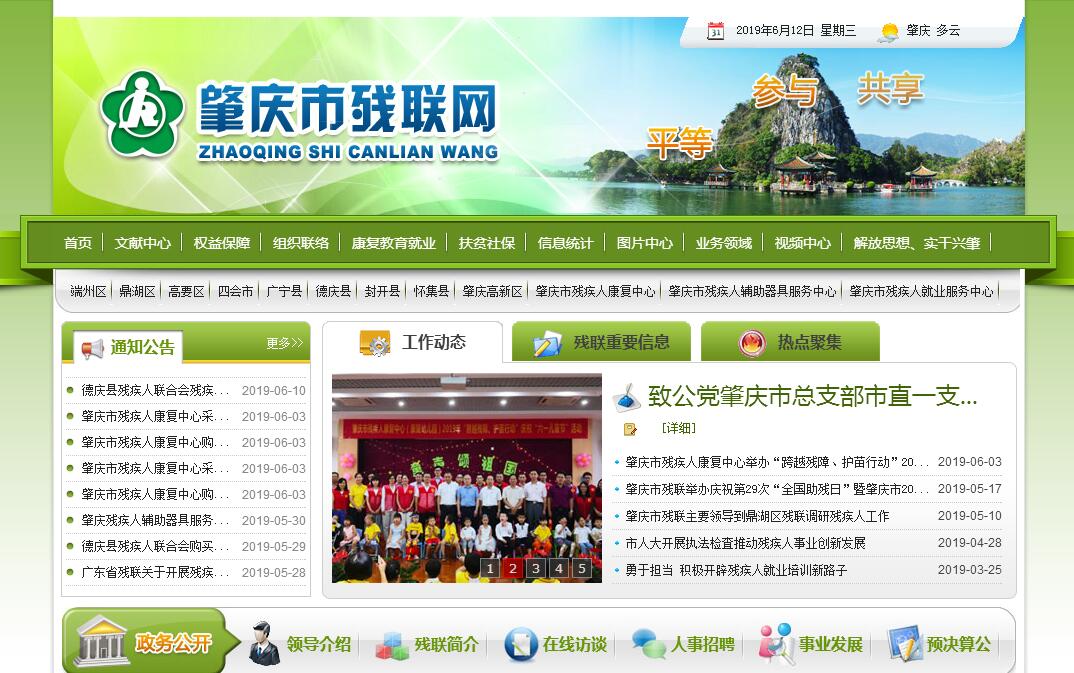 肇庆市残疾人联合会成立于1991年,1993年经市编委批准单列,升格为独立核算的正处级机关事业单位,具有“代表、服务、管理”职能:代表残疾人的共同利益,维护残疾人的合法权益;团结教育残疾人,为残疾人服务;履行政府委托的部分行政职能,管理和发展残疾人事业。市残联内设科室3个:办公室、康复教育就业科、组织宣传文体维权科;直属正科级事业单位3个:市残疾人康复中心、市残疾人辅助器具服务中心、市残疾人劳动就业服务部。肇庆市残疾人联合会机关的主要任务是:一、听取残疾人意见,反映残疾人需求,维护残疾人权益,为残疾人服务。二、团结、教育残疾人遵守法律,履行应尽的义务,发扬乐观进取精神,自尊、自信、自强、自立,为社会主义建设贡献力量。三、弘扬人道主义,宣传残疾人事业。沟通政府、社会与残疾人之间的联系,动员社会理解、尊重、关心、帮助残疾人。四、开展残疾人康复、扶贫、教育、劳动就业、文化、体育、辅具用品供应、福利、社会服务、无障碍设施和残疾预防工作,创造良好的环境和条件,扶助残疾人平等参与社会生活。五、协助政府研究、制订和实施残疾人事业的政策、规划和计划;起草有关保障残疾人权益的地方性法规草案;调查掌握残疾人状况,向政府提出决策建议,对有关业务领域进行指导和管理。六、协助县(市、区)党委考察残联领导班子和做好残联干部的管理工作,对各县(市、区)残联(协会)领导干部进行培训。七、承担市政府残疾人工作协调委员会的日常工作,做好综合、组织、协调和服务。八、组织实施残疾人分散按比例就业工作。九、指导和管理各类残疾人社团组织。十、统筹开展为残疾人事业募捐活动。十一、开展残疾人事业的对外交流与合作。十二、承担市委、市政府和上级残联交办的工作。