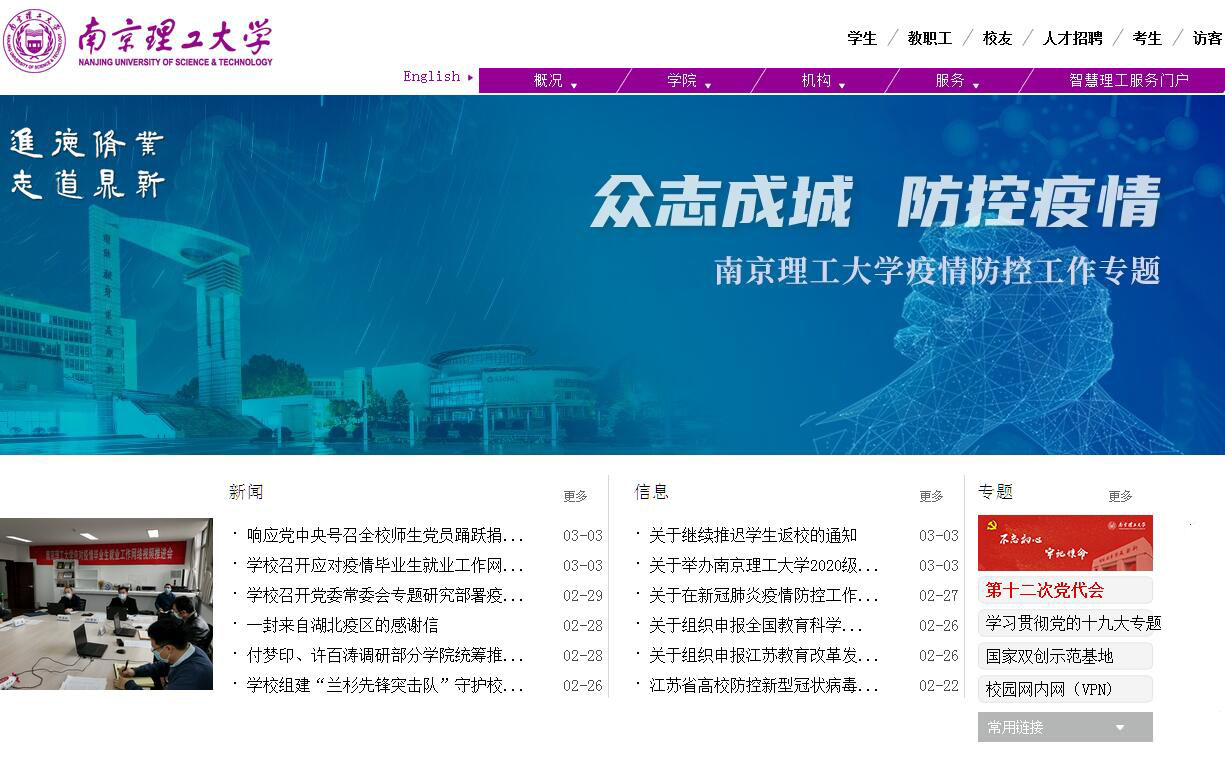 南京理工大学是隶属于中华人民共和国工业和信息化部的全国重点大学,坐落在钟灵毓秀、虎踞龙蟠的古都南京。学校由创建于1953年的新中国军工科技最高学府---中国人民解放军军事工程学院(简称“哈军工”)分建而成,经历了炮兵工程学院、华东工程学院、华东工学院等发展阶段,1993年更名为南京理工大学。1995年,学校成为国家首批“211工程”重点建设高校;2000年,获批成立研究生院;2011年,获批建设“985工程优势学科创新平台”;2017年,学校入选“双一流”建设高校,“兵器科学与技术”学科入选“双一流”建设学科;2018年,王泽山院士获得2017年度国家最高科学技术奖,中共中央总书记、国家主席、中央军委主席习近平亲自为王泽山院士颁奖。学校坚持“以人为本,厚德博学”的办学理念,秉持“进德修业,志道鼎新”的校训,弘扬“团结、献身、求是、创新”的校风,以服务国家战略需求、推动社会进步为使命,致力于建设国内一流、国际知名的特色高水平研究型大学。学校学科门类齐全,办学特色鲜明。现有机械工程学院、化工学院、电子工程与光电技术学院、计算机科学与工程学院、经济管理学院、能源与动力工程学院、自动化学院、理学院、外国语学院、公共事务学院、马克思主义学院、材料科学与工程学院、环境与生物工程学院、设计艺术与传媒学院、知识产权学院等15个专业学院,以及钱学森学院、中法工程师学院、国际教育学院、创新创业教育学院、继续教育学院,并与合作方联合创办了南京理工大学紫金学院和南京理工大学泰州科技学院两个独立学院。学校在长期发展过程中形成了兵器与装备、电子与信息、化工与材料三大优势学科群,工程学、化学、材料科学、计算机科学4个学科进入ESI国际学科领域全球排名前1%。现有国家重点学科9个,江苏省优势学科6个,江苏省重点学科9个,工信部重点学科7个,国防特色学科10个;国家级特色专业9个,教育部卓越工程师培养计划试点专业13个,江苏省重点专业类12个(覆盖38个本科专业),江苏省品牌专业6个;博士后流动站16个,博士学位授权点50个,硕士学位授权点117个;具有专业学位授权点12个,其中工程硕士涵盖27个工程领域;具有高级管理人员工商管理硕士(EMBA)授予权。具有在职人员以同等学力申请博士、硕士学位的授予权以及外国留学生和港澳台学生的招生权。学校现有各类在校生30000余名,留学生1000余名。学校坚持以师为本,师资力量雄厚。具有教授任职资格整体审定权和博士生指导教师资格审批权。现有教职工3200余人,专任教师1900余人,教授、副教授1200余人,其中,两院院士16人,外国院士3人,“长江学者”18人,“千人计划”专家20人,“万人计划”专家14人,“国家杰出青年基金”获得者8人,“国家级教学名师奖”获得者3人,首届“全国创新争先奖”获得者3人,国务院学位委员会学科评议组成员5人(其中召集人1人),“国家百千万人才工程”人选14人,国家级、省部级有突出贡献中青年专家25人,享受国务院政府特殊津贴201人,入选教育部“新世纪优秀人才支持计划”“江苏双创计划”“江苏特聘教授”等省部级以上人才计划300余人。拥有首批全国高校黄大年式教师团队1个、教育部创新团队5个、国家级教学团队5个、国防科技创新团队8个、江苏省创新团队24个。学校先后入选“江苏省高层次人才创新创业基地”和“国家创新人才培养示范基地”。学校坚持立德树人,育人成果丰硕。始终坚持人才培养的中心地位,立足精英教育,培养基础宽厚,知识、能力、素质协调发展的高级专门人才和工程精英,造就求真务实、开拓创新、引领发展、具有国际视野的社会中坚。60多年来,累计为国家培养输送了18万余名各类高级专门人才,其中13人当选两院院士,许多人成为高校、科研机构、企业和政府部门的领导和骨干。近十年来,学校获得国家级教学成果奖5项;省部级教学成果奖32项,其中特等奖4项、一等奖12项。学校创新创业教育工作成效显著,是全国18所获批国家双创示范基地的高校之一,也是首批“全国创新创业典型经验高校”“全国创新创业教育改革示范高校”,同时首批“中美青年创客交流中心”和“全国高校实践育人创新创业基地”落户高校;在“互联网+”大学生创新创业大赛、“挑战杯”全国大学生课外学术科技作品竞赛、研究生创新实践系列大赛等重大赛事中屡获佳绩,其中,在第十四届“挑战杯”竞赛中,学校以总分全国第一的成绩,成为第七个捧得“挑战杯”的高校。学校坚持创新引领,科技优势突出。始终坚持面向国家重大战略,瞄准科技前沿,在先进发射、高效毁伤、光电信息、远程压制、智能无人平台等国防科技领域代表着国家水平。学校现有国家级重点实验室1个,国家级工程技术研究中心1个,国家地方联合工程实验室1个,国家级技术研究推广中心1个,国家级技术转移示范机构1个,国家级质检中心1个,省部级重点实验室21个,省部级工程(技术)研究中心31个,省部级哲学社会科学研究基地10个,建有国家大学科技园,并以此为依托承担了一大批国家重大科研任务,取得了一批标志性科研成果。近十年来,学校获得省部级及以上科技奖励279项,其中国家级科技奖励19项(国家最高科学技术奖1项,国家技术发明一等奖1项,国家自然科学二等奖2项,国家技术发明二等奖7项,国家科技进步二等奖8项)。