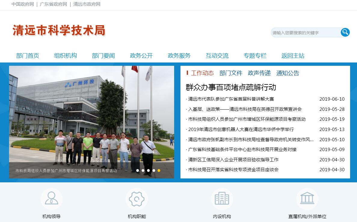 清远市科学技术局主要职责:(一)贯彻执行国家和省有关科学技术工作、专利工作、防震减灾工作的方针政策和法律法规,编制有关发展的中长期规划和年度计划,起草有关地方规范性文件,并组织实施和监督检查。(二)会同有关部门制定实施省重大科技专项的地方配套政策,组织申报省重大科技专项。(三)负责推进全市创新体系建设工作,会同有关部门编制全市创新体系建设规划,拟订促进全市知识创新、技术创新的政策措施,制定科研条件保障规划和提出相关政策,拟订科技促进企业自主创新的政策措施,会同有关部门组织申报广东省创新型企业和自主创新产品的认定,推动企业自主创新能力建设。(四)会同有关部门拟订推进高新技术及其产业化政策,指导高新技术产业化及应用技术的开发与推广,会同有关部门组织申报高新技术企业和高新技术产品的认定,指导高新技术产业开发区、各类科技示范推广基地的建设。(五)牵头拟订促进产学研结合的地方配套政策,组织实施省产学研合作行动计划项目,会同有关部门制定科技成果推广政策,指导科技成果转化工作,组织相关重大科技成果应用示范。(六)组织拟订科技促进农村和社会发展的政策措施,会同有关部门推进全市农村信息直通车工程和专业镇科技创新示范试点建设,促进以改善民生为重点的农村建设和社会建设。(七)拟订科技服务业发展的政策和规划,拟订促进技术市场、科技中介组织发展的政策措施,负责技术市场、科技中介组织的指导和监督管理,制定科普规划和政策,负责科技评估管理和科技统计管理,培育发展民办科研机构,推进民营科技工作,负责国防科技装备动员相关工作。(八)负责本部门预算中的科技经费预决算及经费使用的监督管理,会同有关部门提出科技投入及优化科技资源配置的重大政策和措施建议。(九)负责市科学技术进步奖评审的组织工作,会同有关部门拟订科技人才队伍建设规划,提出相关政策建议。(十)拟订科技合作与交流的政策措施,组织实施政府间及与有关国际组织间的科技合作项目。(十一)负责组织协调全市保护知识产权工作,推动知识产权创造、运用、保护和管理体系建设,推进知识产权战略合作。(十二)组织开展全市专利行政执法及市场监督管理工作,依法处理和调解专利纠纷、查处专利违法行为,会同有关部门建立知识产权执法协作机制。