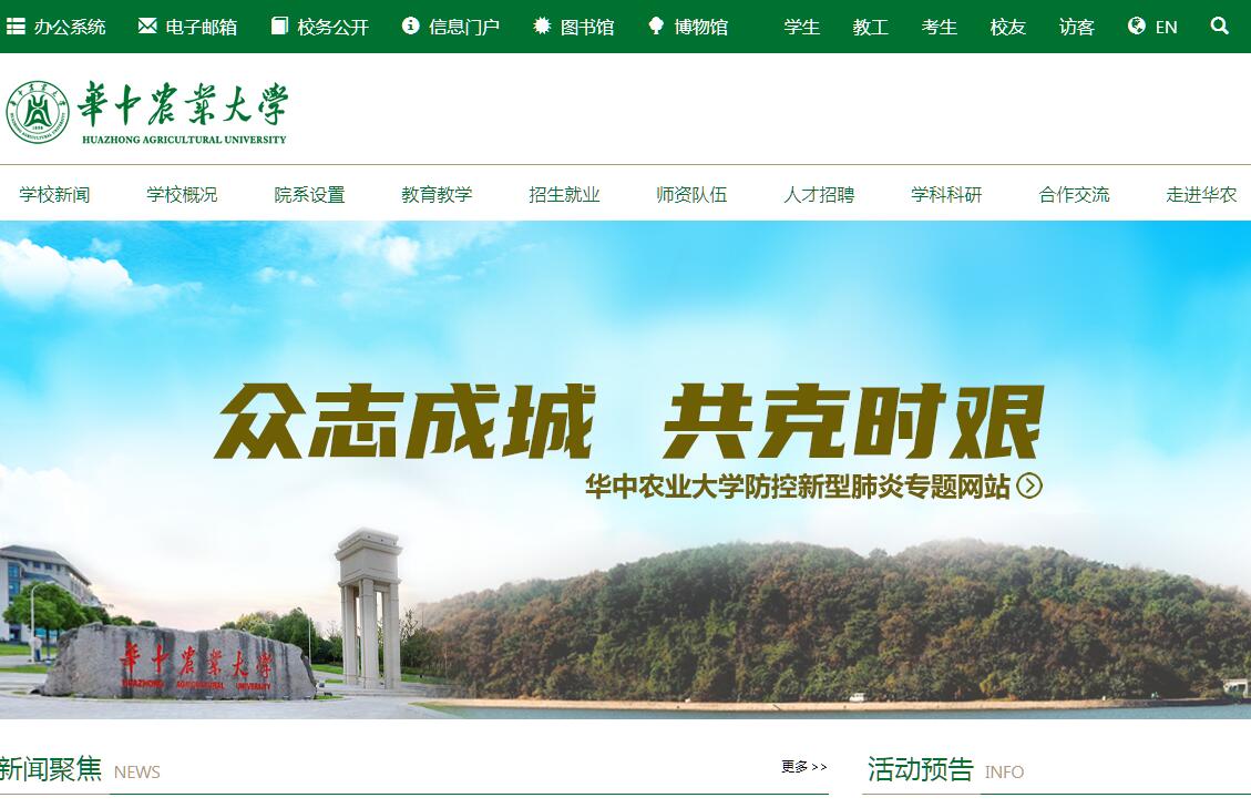 中国高等农业教育起点之一。学校前身是清朝光绪年间湖广总督张之洞1898年创办的湖北农务学堂。几经演变,1952年,武汉大学农学院和湖北农学院的全部系科以及中山大学等6所综合性大学农学院的部分系科组建成立华中农学院。1979年,经国务院批准列为全国重点大学,直属农业部。1985年,更名为华中农业大学。2000年,由农业部划转教育部直属领导。2005年,进入国家“211工程”建设行列。2017年,列入国家“双一流”建设行列。党和国家领导亲切关怀。董必武、李先念等先后为学校题词和题写校名。1998年,时任中共中央总书记、国家主席江泽民为学校百年校庆亲笔题词。2011年,时任中共中央总书记、国家主席胡锦涛听取我校关于生物产业的汇报。2013年,中共中央总书记、国家主席习近平为我校“本禹志愿服务队”亲笔回信。校园环境得天独厚。校园位于湖北省武汉市武昌南湖狮子山,占地面积495万㎡(7425亩),三面环湖,风景秀丽,环境幽雅,建筑楼群鳞次栉比,自然园林风貌引人入胜。学科优势特色明显。生物学、园艺学和作物学学科群、畜牧学、兽医学、农林经济管理5个学科(群)入选国家“双一流”建设学科。在全国第四轮一级学科评估中,7个学科进入A类学科,其中,园艺学、畜牧学、兽医学等3个学科为A+,生物学为A,食品科学与工程、作物学、农林经济管理等3个学科为A-。据美国信息科技所《基本科学指标》数据库(ESI)2017年9月统计数据显示,我校共有7个学科进入ESI全球排名,植物学与动物学领域进入全球前1‰行列,农业科学、化学、生物学与生物化学、分子生物学与遗传学、微生物学、环境科学/生态学等6个学科进入全球前1%。教育体系完整。现有学院(部)18个,本科专业60个,硕士学位授权一级学科27个,硕士专业学位授权类别10个,博士学位授权一级学科15个,博士专业学位授权类别1个,博士后科研流动站13个。全日制在校学生26196人,其中本科生18763人,研究生7433人。硕彦俊秀荟萃。现有教职工2632人,其中教师1525人,教授405人。有中国科学院院士1人,中国工程院院士3人,美国科学院外籍院士1人,第三世界科学院院士2人,千人计划专家25人,万人计划专家28人,长江学者28人,国家杰青20人,973计划首席科学家6人,现代农业产业技术体系首席科学家1人、岗位科学家55人。国家自然科学基金创新研究群体3个,省部级优秀创新团队60个。国家级教学名师4人,国家教学团队7个。教育教学改革卓有成效。累计获国家级教学成果奖22项,其中特等奖1项、一等奖3项、二等奖18项。“十二五”期间,获批国家教育体制改革项目1项、国家专业综合改革试点专业2个、国家“卓越工程师教育培训计划”专业2个、国家“卓越农林人才教育培养计划”专业8个、国家级实验教学示范中心4个、国家级大学生校外实践基地10个、教育部农业部农科教合作人才培养基地6个、国家级精品资源共享课32门、国家级精品视频公开课10门、国家级精品在线开放课程9门、国家级“十二五”规划教材18种。科技实力雄厚。有国家重点实验室2个,国家地方联合工程实验室1个,专业实验室4个,国家级研发中心7个,国际科技合作基地6个,部省级重点(工程)实验室26个,部省级研发中心26个,高等学校学科创新引智基地(“111”计划)5个,引进国外智力成果示范推广基地1个,校企共建实验室(研发中心)35个,省级高校人文社科重点研究基地4个。“十二五”期间,获批科研项目5388项,经费31.29亿元。在杂交油菜、绿色水稻、优质种猪、动物疫苗、优质柑橘、试管种薯等研究领域,取得一批享誉国内外的标志性成果。精神文明建设成绩优异。1996年以来,学校连续十次被评为湖北省最佳文明单位,2005年获全国精神文明建设先进单位,2008年以来三度荣膺全国文明单位。2017年获评首届全国文明校园。