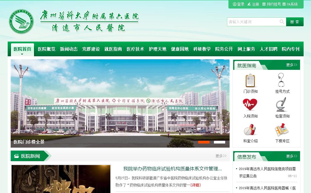 清远市人民医院,又名广州医科大学附属第六医院、广州医科大学第六临床学院,始建于1939年,国家首批三级甲等医院,全国百佳医院,广东省博士后创新实践基地,国家住院医师规范化培训基地,承担了涵盖本科、硕士、博士、博士后、医师规培等完整的大学医学教育和毕业后培训任务。上个世纪90年代,因创立“优质高效低耗”医院管理模式而成为当时全国医院改革的一面旗帜。荣获“全国文明单位”、“全国先进基层党组织”、“全国卫生系统先进集体”、“全国创建文明行业先进单位”等省级以上荣誉30余个。2017年通过三级甲等医院复审。医院总建筑面积22.3万平方米,其中新院区建筑面积15.6万平方米,占地面积16.5万平方米。医院编制床位数2560张,实际开放床位1780张,共设临床科室、医技科室52个,设立临床技能培训中心、临床生物标本库、临床药物一期试验病房、分子诊断中心、基础实验研究室、实验动物房等科教平台。现有在岗员工2872人,其中高级职称292人,医学博士57人,博士导师15人,硕士导师31人,享受国务院政府特殊津贴专家2人,潇湘学者2人,岭南名医7人,省杰出青年医学人才7人,清远市紧缺适用高层次人才106人,担任省级及以上专业委员会学术职务共268人。现有中国医师协会心脏病诊疗基地、卫生部脑卒中筛查与防治基地、中国胸痛中心医院三个国家级诊疗基地,拥有妇产科、产科、普通外科、消化内科、感染科、耳鼻喉科、眼科、口腔科、肾内科、麻醉科、病理科、临床护理12个省级临床重点专科,22个清远市重点学科。拥有瑞典林雪平大学尿控动力学实验室、美国迈阿密大学米勒医学院、中国医药大学附设医院(台湾)、广州医科大学基础医学院、广州医科大学神经科学清远工作站、广州呼吸疾病研究所清远工作站、广州妇产科研究所清远工作站、广州医科大学研究生创新培养基地、暨南大学研究生培养基地、徐州医学院研究生培养基地、广东省创伤救治科研中心清远创伤基地、暨南大学转化医学研究院等12个大学合作平台。现有固定资产总值14.14亿元,拥有PET-CT、320排CT、3.0T核磁共振、DSA、直线加速器等先进医疗设备3000余台。2017年,门急诊量180.23万人次;出院人数8.44万人次;手术量5.98万台次;CD型病例占比52.18%;三四级手术占比48.66%。“2017年中国地级城市医院竞争力榜单”医院排名第55,2016、2017年广东省公立医院绩效评价连续排名全省第二。医院始终坚持“以人民健康为中心,一切为了人民健康”的办院宗旨,按照“全面融入广州,加强学科建设;改善就医服务,提升就医体验;加强医院管理,提质降耗增效;真心帮扶基层,提升基层能力”的发展思路,全力打造“粤北医学中心,人民心中医院”。本着“尽我所能,为身心受到折磨的患者提供关爱和帮助”的行为准则,着力建设一所有良知有温度有爱心、行业认可、百姓满意、员工自豪的粤北医学中心。医院实施便民惠民运营战略。即:在保障安全、质量和提供优质、便捷服务的前提下,合理控制患者医疗费用,同时设法降低医院运营成本,提高运营效果。患者就医成本得到有效控制,2017年,全院药品占比27.82%,住院患者人均费用10,746元,为全省同级医院的70%左右,为广州市同级医院的50%左右, 出院病人平均住院床日为7.44天,门诊“三长一短”现象已基本消失。2017年人力成本占支出比为37.63%,医院运营成本控制在合理区间。大力弘扬仁爱精神。2010年5月启动“天使医疗行动”,对患先心病等大病的贫困患者实施专项救助,已累计筹集资金2000多万元,救助了2,165名贫困患者,资助金额达2,155万元。自2005年派出第一批驻院医疗队至今,共派出15批100多名医疗骨干,奔赴“三连一阳”地区进行帮扶,帮助基层医院提高医疗服务能力和管理水平。2014年1月医院托管佛冈县医院集团,2014年11月托管连山壮族瑶族自治县人民医院,建立了以我院为中心的清远市远程心电、影像、病理诊断中心,成为省内、乃至国内医联体建设的典范。医院对危急重症病人开辟绿色通道,使急性心梗、急性脑卒中等病种的大批危急重症患者得到了快速有效救治。2017年起医院全面推行“先诊疗后付费”服务模式,成为我省最早实行此模式的地市级医院之一。医院大力弘扬白求恩式医生精神,为 “广东省培育和践行社会主义核心价值观示范单位”的10家医院之一。近年来,医院涌现出中国医院优秀院长周海波;全国先进女职工郑淑姝;全国先进工作者张发岐;全国卫生系统职业道德建设标兵郭晓燕;全国巾帼建功标兵蔡艳芳;全国优质护理服务表现突出个人牟丹;广东好人夏明凯、张小勇、蒋重和;广东省三八红旗手卢亚梅;广东省“最美产科医生”雷慧中;广东省“最美药师”钟志华;广东省“最美助产士”成金焕;广东省十大“我最喜爱的健康卫士”程忠才等一大批先进典型。全院干部员工正以豪迈的热情,传承前人的光辉事业,秉承“责任、团队、仁爱、奉献”的核心价值观,坚持 “技术立院、人才强院、科教兴院、和谐固院”,以大学对直属附院的标准,建设高水平医院和区域医学中心,为提高清远地区医疗服务能力,提高清远及周边地区人民健康水平而努力奋进!