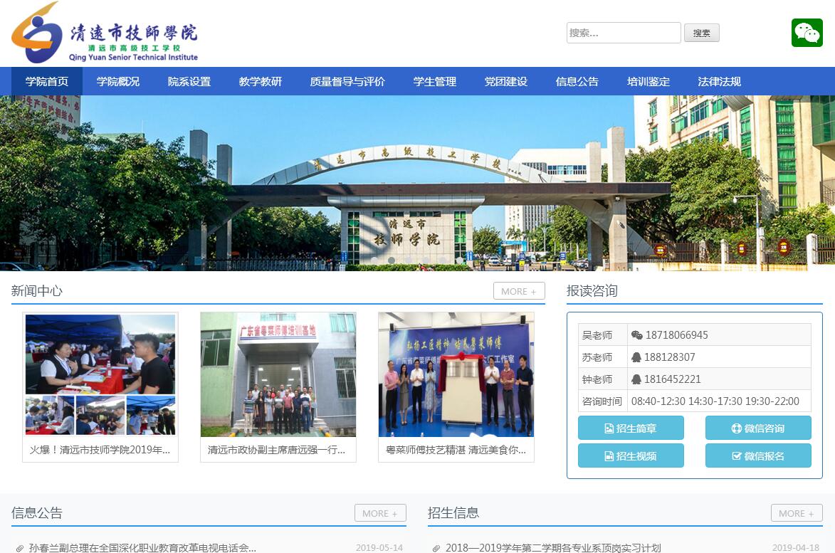 清远市技师学院(高级技工学校)是得到谢非、李长春、张德江、汪洋、胡春华五任广东省委书记和省长卢瑞华、黄华华及省委省政府黄丽满、肖志恒、谢强华等领导关注、视察和肯定的高级技工教育综合培训基地,是全省唯一的国务院扶贫办劳动力转移培训示范基地,清远市唯一的高技能人才公共实训基地,也是全省智力扶贫的发源地。学校自1995年建校以来,在上级领导的重视关怀、社会各界的大力支持和广大干部职工的艰苦努力下,不断实现跨越式发展,1997年被批准为省一类技工学校,1999年被批准为省重点技工学校,2002年晋升为国家级重点技工学校,2004年晋升为高级技工学校,2005年被国务院扶贫办认定为广东省唯一的“国务院扶贫办劳动力转移培训示范基地”,2006年被省劳动保障厅批准在高级技工学校的基础上设立技师学院。2009年通过省政府技师学院复评。学院以“面向市场,培养技能人才,服务经济社会发展”为办学宗旨,注重技能教学,建有各专业实习实训场所170多间,拥有众多先进的各类实习设备,设有汽车工程、数控模具工程、机电工程、生态产业、财经商贸、文化创意六大专业系,开设有为汽车、机械、机电、食品、 制药、广告、酒店等行业和各类服务业及幼儿园等企事业单位培养技能人才的专业28个。现有在校学生一万多人。毕业生一次就业率100%。建校22年来,共为社会培养了4万余名各类合格技能人才,资助山区近2万名贫困学生掌握技能。2000年学校被劳动和社会保障部授予“集体一等功”,2003年、2005年学校党组织两次被省委组织部授予“全省先进基层党组织”光荣称号,2006年学校党组织被中共中央组织部授予“全国先进基层党组织”光荣称号。学院对未来的办学工作提出了“一体两翼促发展、精工融贯保质量、标准规范强管理、一体双元创特色”的办学思路。目前,学校正在通过实施教学一体化改革、制定和实施“168工程”建设方案、深化校企合作等不断促进学校内涵发展、科学发展,着力打造一流示范性技工院校,为广东加快经济发展方式转变、全面建设小康社会做出新的积极的贡献。
