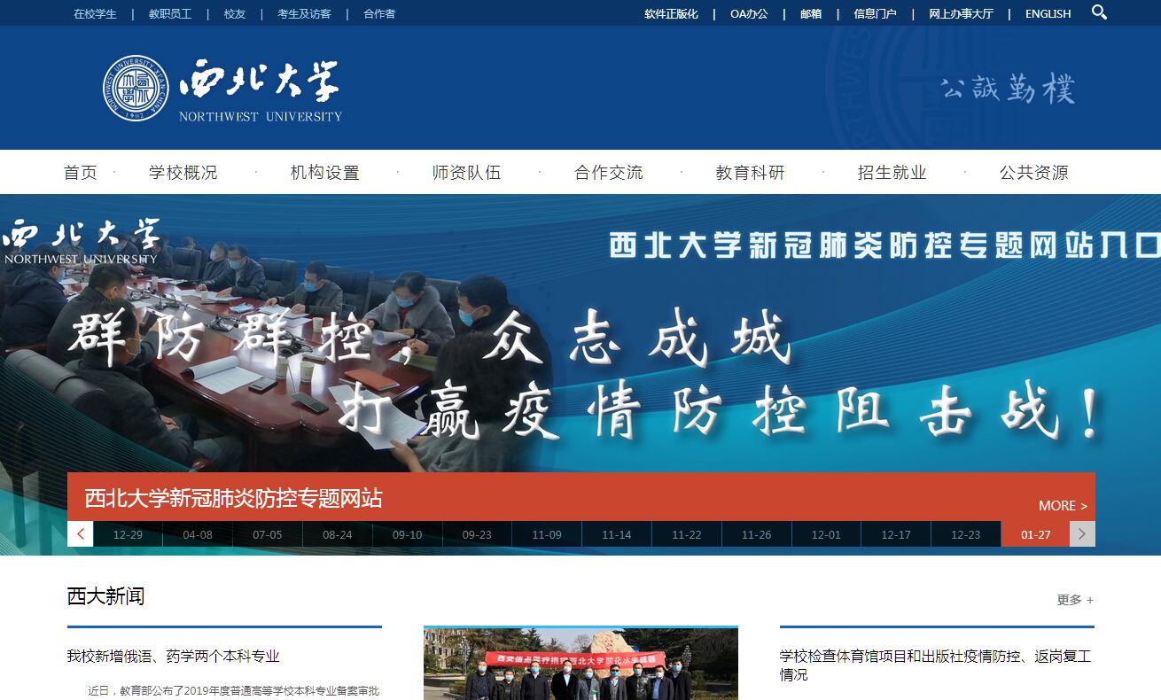 西北大学肇始于1902年的陕西大学堂和京师大学堂速成科仕学馆。1912年始称西北大学。1923年改为国立西北大学。1937年西迁来陕的国立北平大学、北平师范大学、北洋工学院和北平研究院等组成国立西安临时大学,1938年改为国立西北联合大学,1939年复称国立西北大学。新中国成立后为教育部直属综合大学。1950年复名西北大学。1958年改隶陕西省主管。1978年被确定为全国重点大学。现为首批国家“世界一流学科建设高校”,国家“211工程”建设院校、教育部与陕西省共建高校。在长期的发展历程中,西北大学形成了“发扬民族精神,融合世界思想,肩负建设西北之重任”的办学理念,汇聚了众多名师大家,产生了一批高水平学术成果,培养了大批才任天下的杰出人才,享有良好的学术声誉和社会声望,被誉为“中华石油英才之母”“经济学家的摇篮”“作家摇篮”。学校现有太白校区、桃园校区、长安校区三个校区,总占地面积2360余亩。现有23个院(系)和研究生院,86个本科专业。学校现有24个博士学位授权一级学科、37个硕士学位授权一级学科、14个专业学位授权类别。现有1个一级学科国家重点学科(涵盖5个二级学科)、4个二级学科国家重点学科和1个国家重点(培育)学科,22个博士后科研流动站。学校拥有1个国家重点实验室、1个国家工程技术研究中心,3个国家国际科技合作基地,1个高等学校学科创新引智计划(简称“111计划”)基地,1个国家创新人才培养示范基地,3个国家地方联合工程研究中心,1个省部共建国家重点实验室培育基地,7个国家级实验教学示范中心,1个国家级虚拟仿真实验教学中心,7个国家级人才培养基地并设有国家大学生文化素质教育基地,39个省部级理工类科研基地和17个省部级人文社科研究基地。现有教职工2740人,其中中科院院士3人,双聘院士(教授)10人,国际科学史研究院院士1人,“长江学者奖励计划”专家20人,国家“千人计划”项目入选者17人,国家“万人计划”项目入选者12人,国家杰出青年科学基金获得者9人、国家优秀青年科学基金获得者9人,国家“百千万人才工程”人选14人,国家级教学名师4人,教育部新世纪优秀人才支持计划21人,科技部“中青年科技创新领军人才”5人。全日制在校生25467人,其中全日制本科生13526人,研究生7592人,留学生1036人。学校先后获得国家自然科学奖一、二等奖,国家技术发明奖二等奖,国家科技进步奖二等奖,“长江学者”成就奖一等奖、中国专利金奖等重大科技奖励。学校十分重视对外科技文化交流,已与美、英、法、德、日等20余个国家及地区的100余所大学、科研机构建立了友好合作关系。《大英百科全书》曾将西北大学列为世界著名大学之一。
