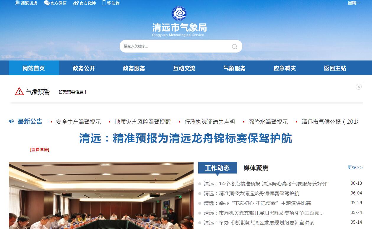 清远市气象局主要职责:1.制定地方气象事业发展规划、计划,并负责本行政区域内气象事业发展规划、计划及气象业务建设的组织实施;负责本行政区域内重要气象设施建设项目的审查;对本行政区域内的气象活动进行指导、监督和行业管理。2.按照职责权限审批气象台站调整计划;组织管理本行政区域内气象探测资料的收集、处理;依法保护气象探测环境;管理本行政区域内气象标准化工作和涉外气象活动。3.负责市重大气象灾害应急指挥部日常工作;负责气象社会管理,承担市三防指挥部、减灾委、应急委、安委会、规委会等机构赋予气象部门的工作任务。4.在本行政区域内组织对重大灾害性天气跨地区、跨部门的联合监测、预报工作,及时提出气象灾害防御措施,并对重大气象灾害做出评估,为本级人民政府组织防御气象灾害提供决策依据;管理本行政区域内气象公共服务工作,负责气象公共服务行业自律和气象服务市场活动的监督管理,组织服务效益和满意度评估;管理本行政区域内公众气象预报、灾害性天气警报以及农业气象预报、城市环境气象预报、火险气象等级预报等各类专业专项气象预报的发布。5.健全防灾减灾体制,组织制订和实施本行政区域气象灾害防御规划、气象灾害应急预案;组织本行政区域内气象灾害防御应急管理工作;承担市突发公共事件预警信息发布的管理工作;组织突发公共事件气象保障应急服务。6.制订人工影响天气作业方案,并在本级人民政府的领导和协调下,管理、指导和组织实施人工影响天气作业;组织管理雷电灾害防御工作,会同有关部门指导对可能遭受袭击的建筑物、构筑物和其它设施安装的雷电灾害防护装置的检测工作;组织建立隐患排查治理体系和安全预防控制体系,承担雷电防护重点区域安全生产、公共场所气象灾害防御设施建设和防御措施落实情况的监察。7.规划气象资源开发利用,负责向本级人民政府和同级有关部门提出利用、保护气象资源和推广应用气候资源区划等成果的建议;组织管理本行政区域气象服务生态文明建设工作,组织建立资源环境承载能力监测预警机制;组织对气候资源开发利用项目进行气候可行性论证;参与市政府应对气候变化工作,组织开展气候变化影响评估、技术开发和决策咨询服务。8.组织开展气象法制宣传教育,负责监督有关气象法律法规的实施,对违反《中华人民共和国气象法》等法律法规的行为依法进行处罚,承担有关行政复议和行政诉讼。9.统一领导和管理本行政区域内气象部门的发展改革与财务、机构编制、人事劳动、科研和培训以及业务建设等工作;会同县级人民政府对所辖气象机构实施以部门为主的双重管理;建立并完善事权和支出责任相适应的财政保障体系,完善双重财务管理体制为基础的综合预算管理;会同地方党委和人民政府做好当地气象部门的精神文明建设和思想政治工作。10.承担上级气象主管机构和本级人民政府交办的其他事项。