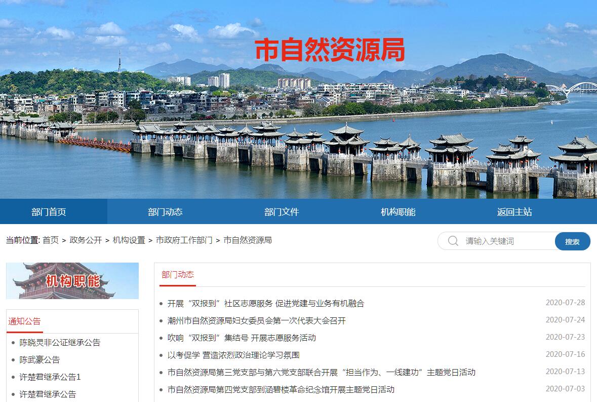 潮州市自然资源局贯彻落实党中央、 省委关于自然资源工作的方针政策和决策部署,按照市委工作要求,在履行职责过程中坚持和加强党对自然资源工作的集中统一领导。其主要职责是:(一)履行全民所有土地、矿产、森林、草地、湿地、水、海洋等自然资源资产所有者职责和所有国土空间用途管制职责。贯彻执行国家、省有关自然资源、国土空间规划和测绘信息管理的法律法规和政策,起草有关地方性法规、规章草案和措施并组织实施。(二)负责自然资源调查监测评价。 建立健全自然资源调查监测评价体制机制。组织实施自然资源基础调查、专项调查和监测评价。负责自然资源调查监测评价成果的监督管理和信息发布。指导监督县(区)自然资源调查监测评价工作。(三)负责自然资源和不动产统一确权登记工作。负责组织、指导各类自然资源和不动产统一确权登记、权籍调查、 不动产测绘、争议调处、成果应用等工作。建立健全全市自然资源和不动产登记信息管理系统。负责全市自然资源和不动产登记资料的收集、整理、共享、汇交管理等工作。负责市城区自然资源和不动产确权登记工作,调处土地、林权等自然资源权属争议。(四)负责自然资源资产有偿使用工作。 建立全民所有自然资源资产统计制度,负责全民所有自然资源资产核算。编制全市全民所有自然资源资产负债表,落实相关考核工作。 贯彻实施全民所有自然资源资产划拨、出让、租赁、作价出资和土地储备政策,合理配置全民所有自然资源资产。负责自然资源资产价值评估管理,依法收缴相关资产收益。(五)负责自然资源的合理开发利用。组织拟订自然资源发展规划,组织实施自然资源开发利用标准,建立政府公示自然资源价格体系,组织开展自然资源分等定级价格评估, 开展自然资源利用评价考核,指导节约集约利用工作。负责自然资源市场监管。组织研究自然资源管理涉及宏观调控、 区域协调和城乡统筹的相关措施。统筹推进全市 “三旧” 改造工作,会同有关部门拟订 “三旧”改造措施并组织实施。(六)负责建立空间规划体系并组织实施。配合组织编制主体功能区规划,组织编制并监督实施国土空间规划和分区规划、控制性详细规划、相关专业和专项规划。指导编制村镇建设发展规划。负责市城市规划区内(潮安区除外)建设用地和建设工程规划管理。负责城市规划设计行业管理。开展国土空间开发适宜性评价,建立国土空间规划实施监测、 评估和预警体系。组织划定生态保护红线、永久基本农田、 城镇开发边界等控制线,构建节约资源和保护环境的生产、 生活、生态空间布局。建立健全国土空间用途管制制度,研究拟订城乡规划有关措施并组织实施。组织拟订并实施土地、 海洋等自然资源年度利用计划。负责土地、海域、海岛等国土空间用途转用工作。 承担协调自然资源有关乡村振兴工作。负责土地征收征用管理工作。(七)负责统筹囯土空间生态修复工作。牵头组织编制国土空间生态修复规划并实施有关生态修复工程。负责国土空间综合整治、土地整理复垦、矿山地质环境恢复治理、海洋生态、海域海岸线和海岛修复等工作。组织实施生态保护补偿制度。(八)负责组织实施最严格的耕地保护制度。牵头拟订并实施耕地保护措施,负责耕地数量、质量、生态保护工作。 组织实施耕地保护责任目标考核和永久基本农田特殊保护。 组织实施耕地占补平衡制度和占用耕地补偿制度。(九)负责矿产资源管理工作。负责矿产资源储量和压覆矿产资源管理工作。承担矿产资源采矿权的审批登记管理工作。负责矿产资源合理利用和保护工作。(十)负责地质环境保护和地质灾害防治工作。负责管理地质勘查行业和全市地质工作。监督管理地下水过量开采及引发的地面沉降等地质问题。落实综合防灾减灾规划、防护标准相关要求,组织编制地质灾害防治规划并组织实施。组织实施全市地质灾害调查评价及隐患的普查、详查、排查。 指导开展群测群防、专业监测、预报预警等工作,指导开展地质灾害防治工作。承担地质灾害应急救援的技术支撑工作。 (十一)负责组织实施海洋战略规划和发展海洋经济。组织实施国家和省海洋发展战略。会同有关部门拟订海洋经济发展、海岸带综合保护利用等规划和措施并组织实施。负责海洋经济运行监测评估工作。(十二)负责海洋开发利用的保护和监督管理工作。负责海域使用和海岛保护利用管理。拟订海域海岛保护利用规划并组织实施。负责无居民海岛、海域、海底地形地名管理工作,监督管理海底电缆、管道铺设及海上人工构筑物设置。 负责海洋观测预报、预警监测和减灾工作,参与海洋灾害应急处置。(十三)负责测绘地理信息管理工作。负责全市基础测绘和测绘行业管理。负责测绘资质资格和信用管理,监督管理测绘地理信息安全和市场秩序。负责地图、地理信息公共服务管理。负责测量标志保护。(十四)负责组织自然资源科技发展工作。指导和组织自然资源系统人员的业务培训、科技人才队伍建设等工作。推进自然资源系统信息化建设和信息资料的公共服务。(十五)负责自然资源行政执法工作。指导、监督自然资源动态巡查工作。查处自然资源开发利用和国土空间规划及测绘违法案件,指导、监督县(区