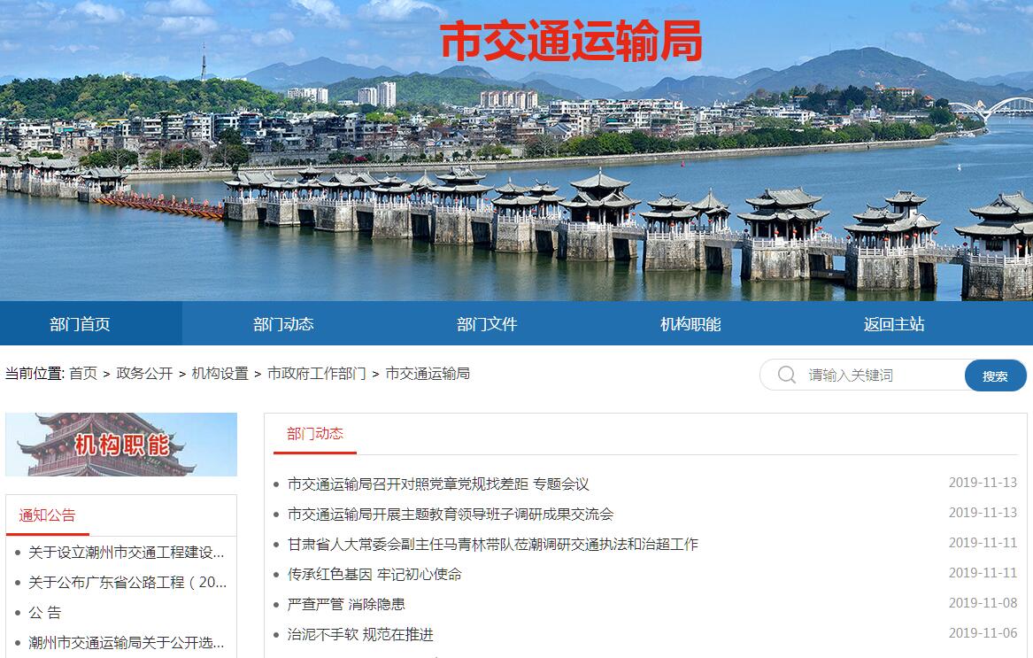潮州市交通运输局主要职责:(一)贯彻执行国家和省有关交通运输工作的方针政策和法律法规并监督实施,负责综合交通运输体系发展协调工作,会同有关部门拟订综合交通运输体系发展战略、专项规划和年度计划,参与拟订物流业发展战略和规划;指导开展公路、水路行业有关体制改革工作;指导、协调综合交通枢纽的规划、建设和管理。(二)承担道路、水路运输市场监管责任,负责城乡客运及有关设施规划和管理工作,负责出租汽车行业管理工作,负责路政、运政和港口管理,负责水路运输、水路运输服务、引航、航道、港口及港航设施建设使用岸线布局的行业管理工作。(三)负责协调政府拨款的公路建设资金的监督和管理,协调或参与交通建设资金的筹集,负责局管交通资金的拨付和监管,负责港口、航运有关规费的征收管理工作。(四)承担公路、水路、地方铁路、轨道交通建设市场监管责任,组织协调公路、水路、地方铁路、轨道交通有关重点工程建设和工程质量、安全生产及造价的监督管理工作,负责交通运输基础设施管理和维护,承担有关重要设施的管理和维护。(五)负责行政检查、行政处罚、行政强制等交通运输综合行政执法工作。(六)负责公路、水路行业安全生产和应急管理工作,组织实施重点物资和紧急客货运输,负责全市重点干线路网运行监测和协调,负责和参与交通战备工作。(七)指导交通运输信息化建设,指导、监督交通运输行业技术标准和规范的实施,指导交通运输行业环境保护和节能减排工作。(八)组织、协调和参与管理公路、水路交通行业利用外资工作,开展对外交流与合作工作。(九)指导和监督县(区)级交通运输主管部门的业务工作;管理属下事业单位。(十)负责协调中央或省垂直管理的民航、铁路、邮政、海事、海关、检验检疫、边检、航道、航标、救助、打捞等管理机构的涉地相关工作。(十一)承办市委、市政府和上级主管部门交办的其他事项。